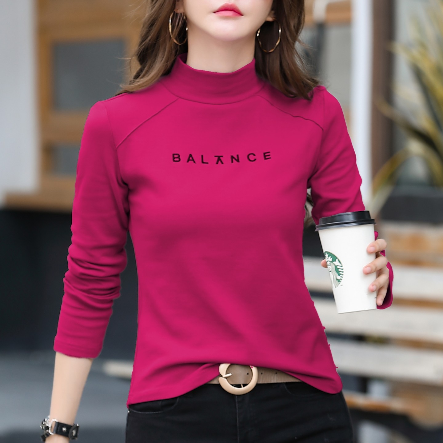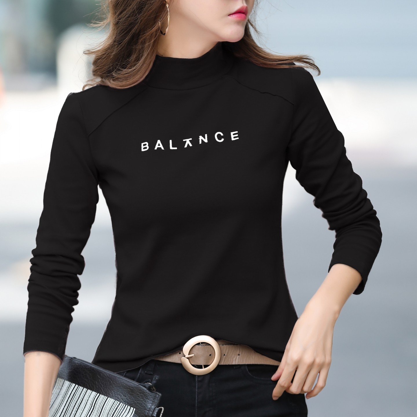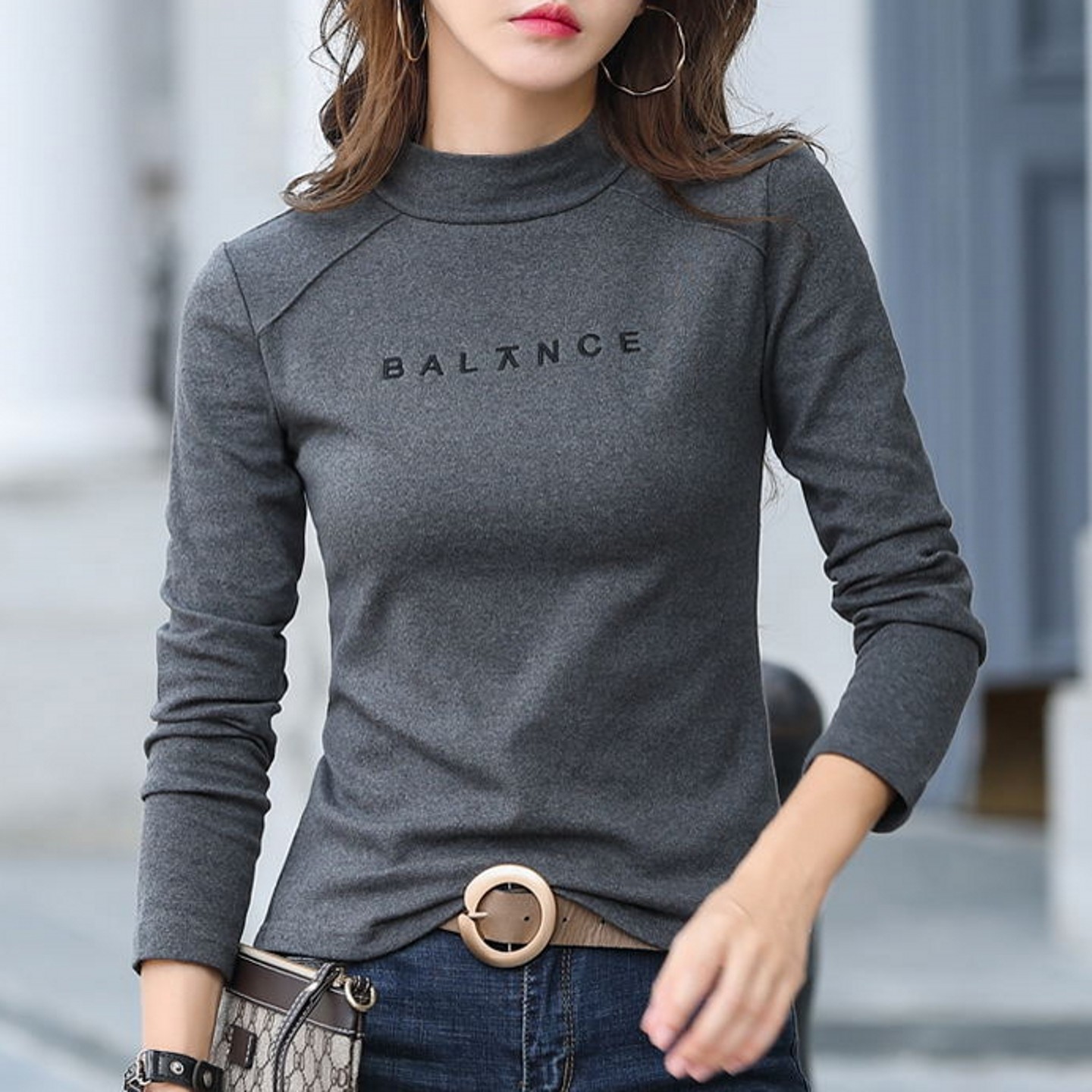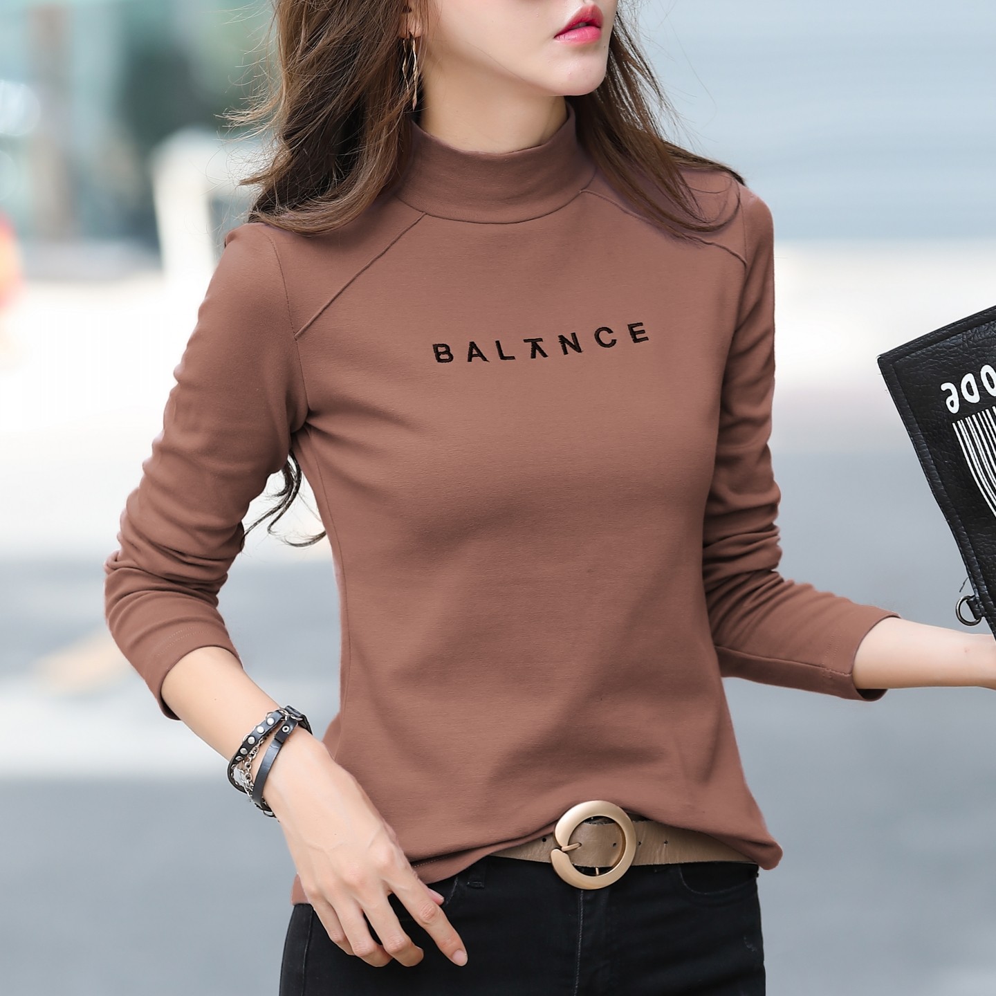 刺绣纯棉半高领打底衫女内搭秋冬可外穿修身长袖t恤磨毛加厚上衣