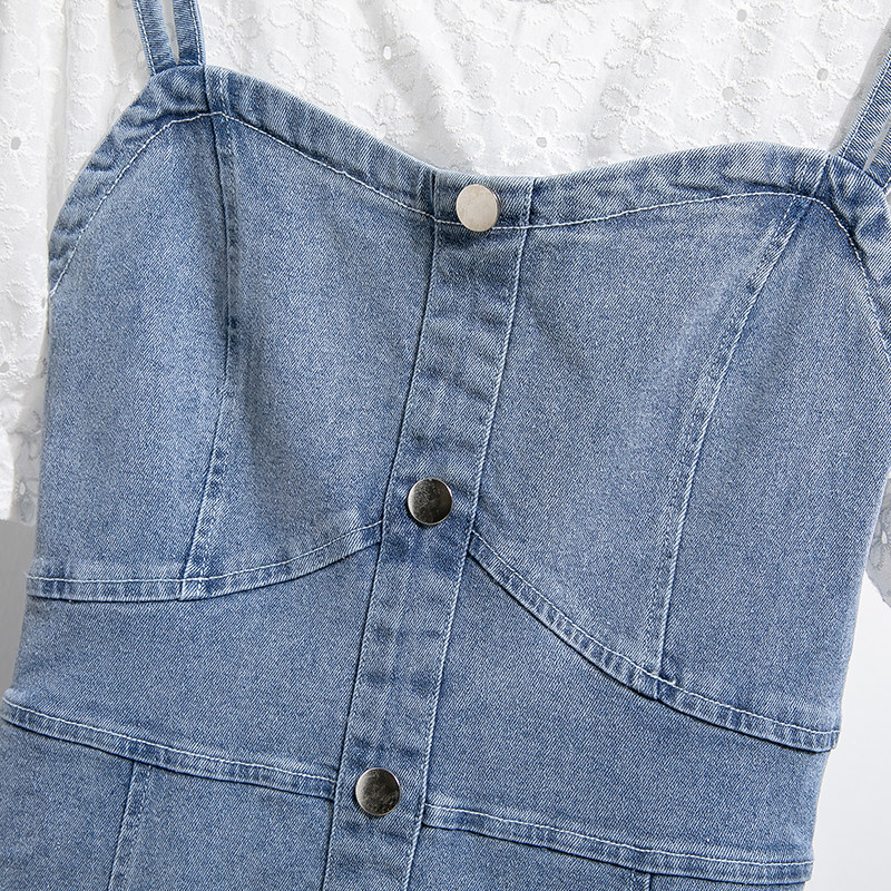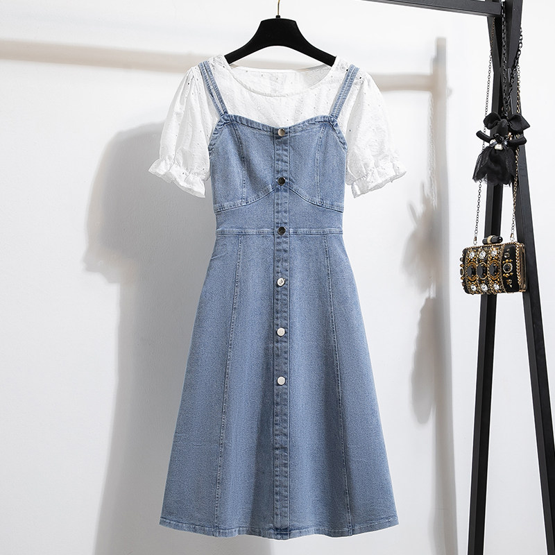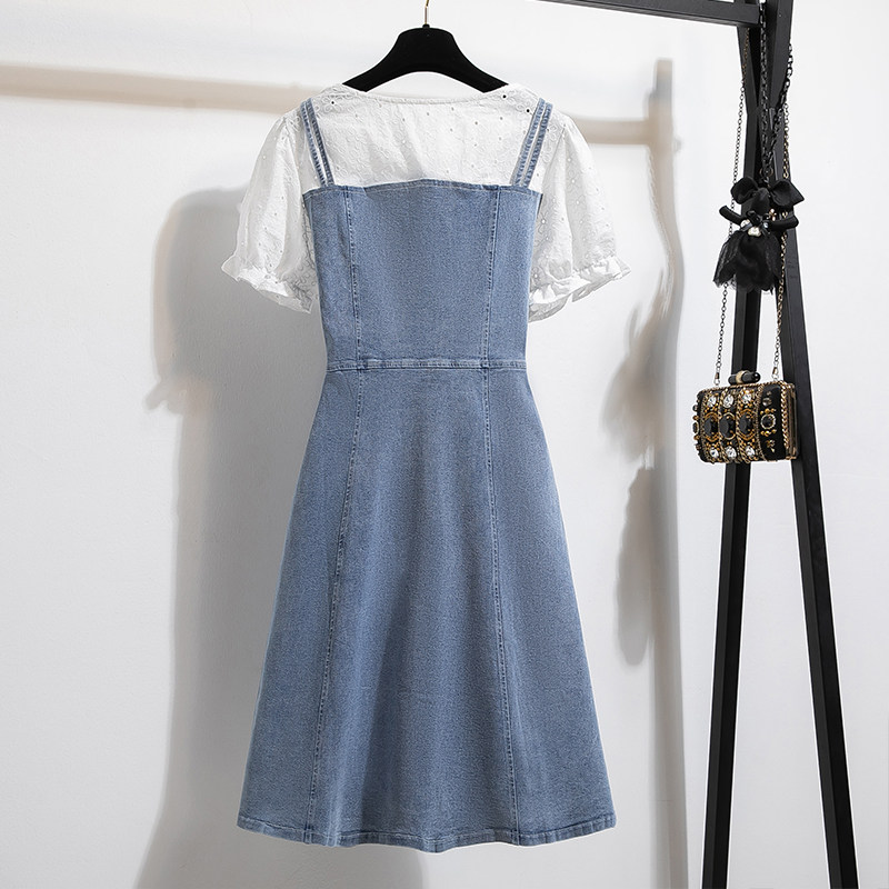 春季新款大码牛仔背带连衣裙女胖MM梨型身材做旧宽松设计感中长裙