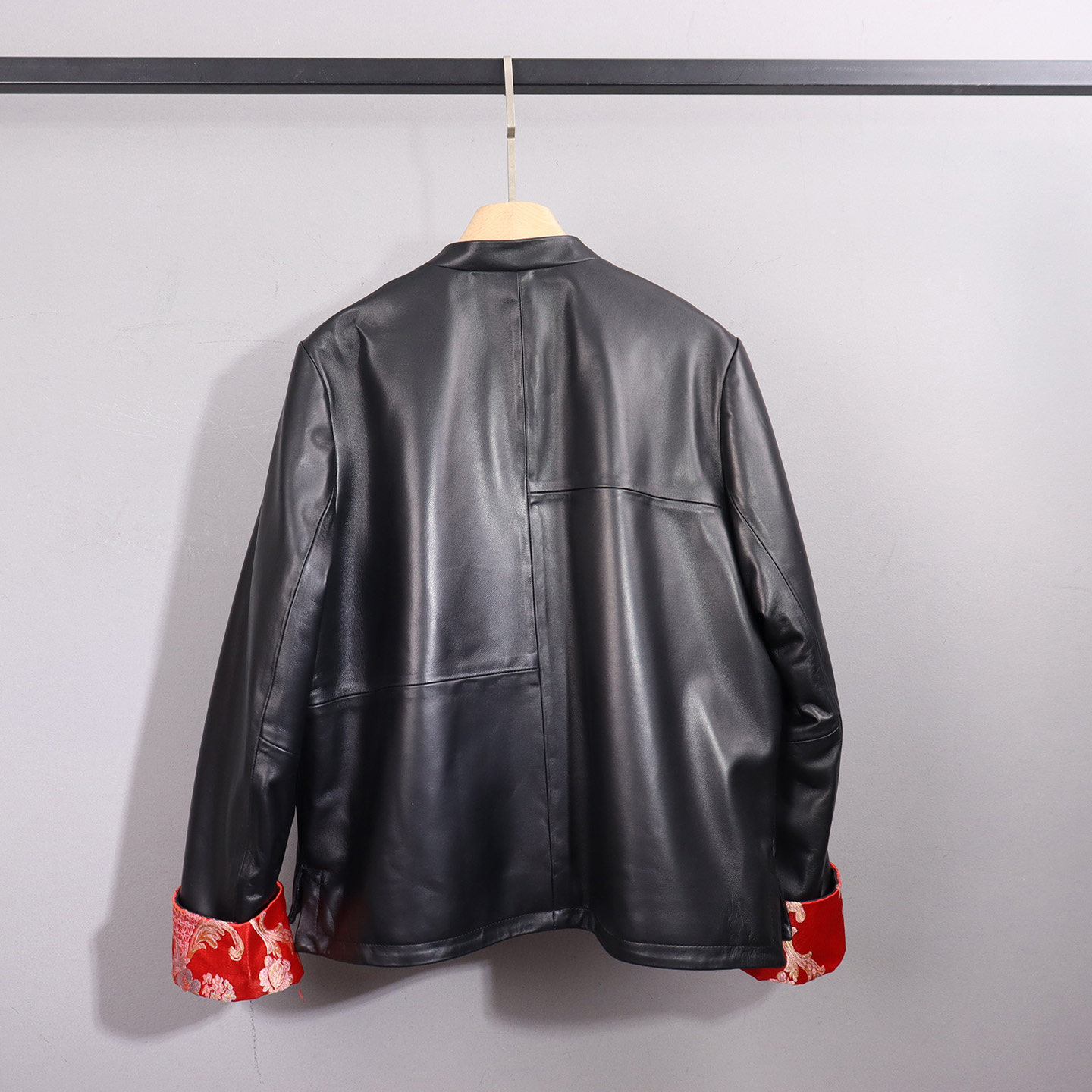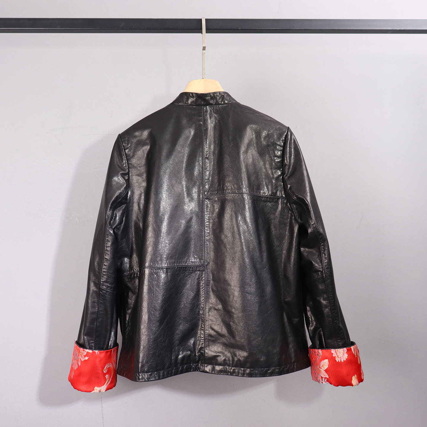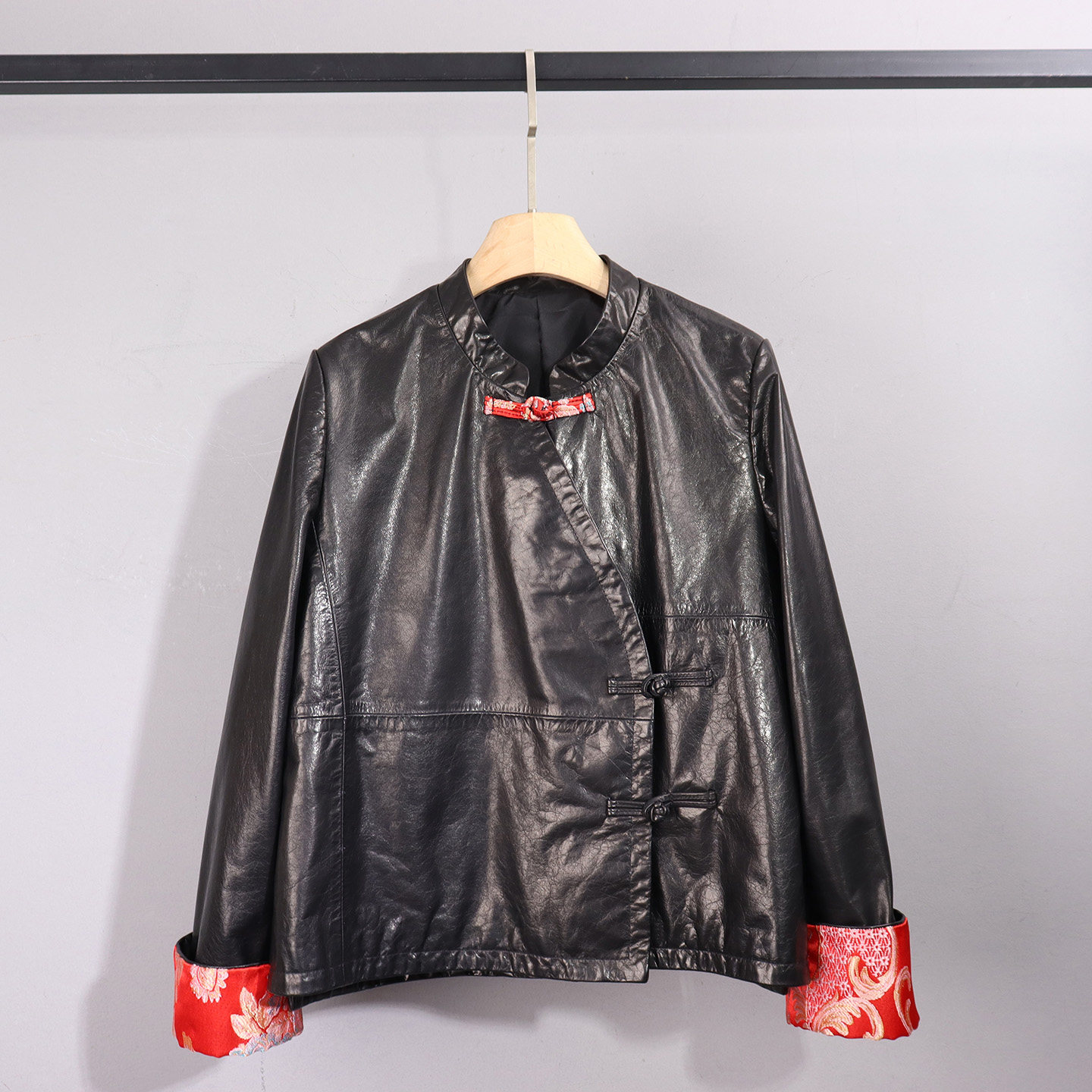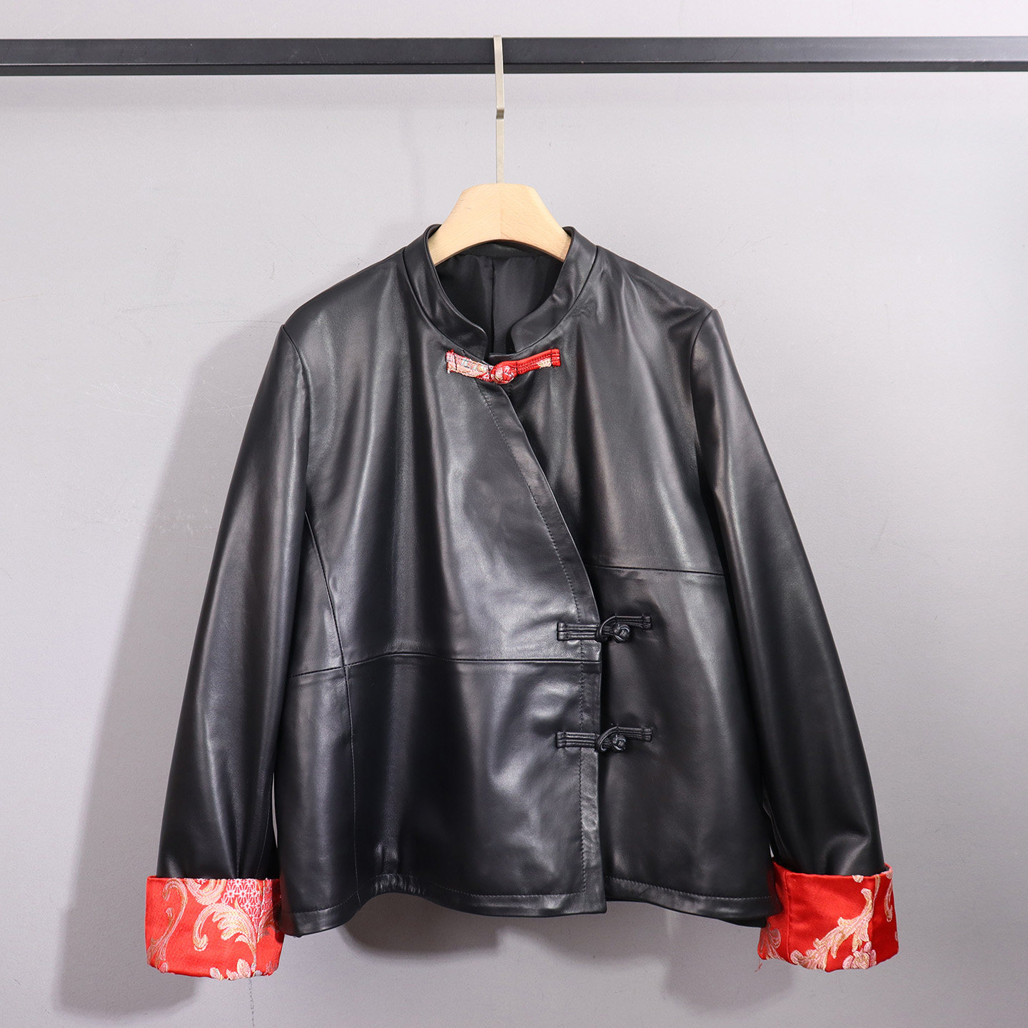 时尚新中式真皮立领皮衣女短款修身盘扣黑色高级感长袖显瘦外套