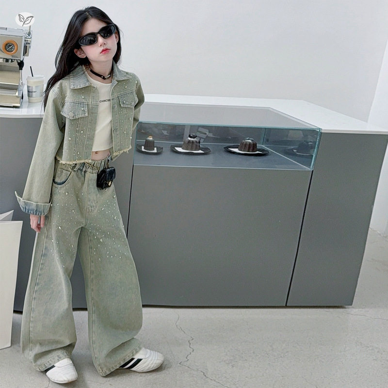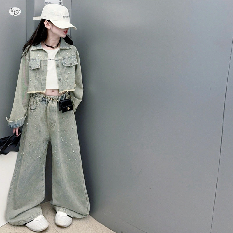 女童牛仔套装2026年春季新款中大童美式钉钻短款外套阔腿裤两件套