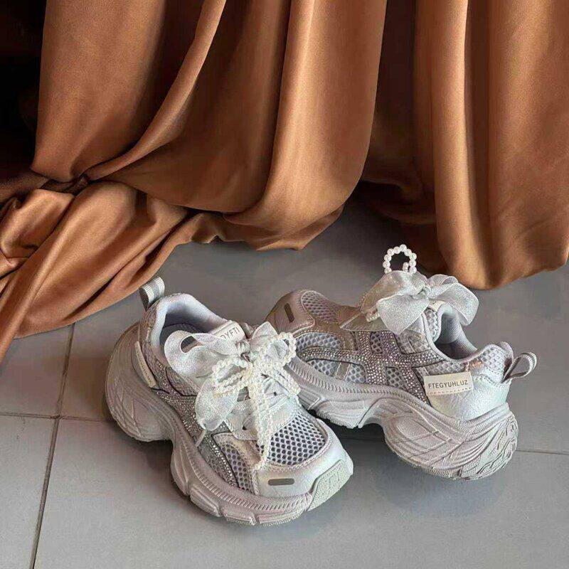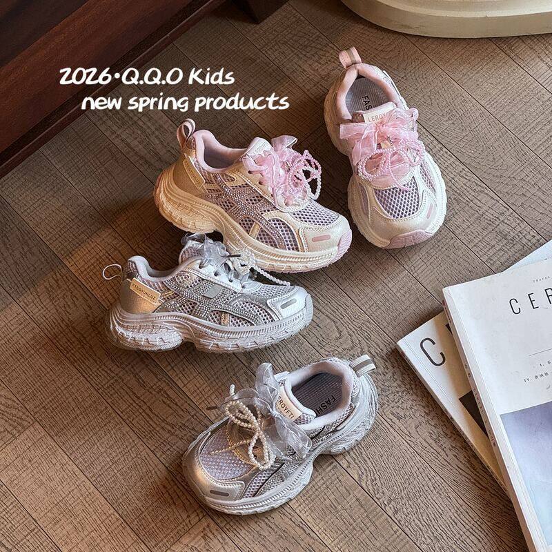 QQO童鞋 2026春夏款儿童单网运动鞋女童甜美蝴蝶结水钻厚底老爹鞋