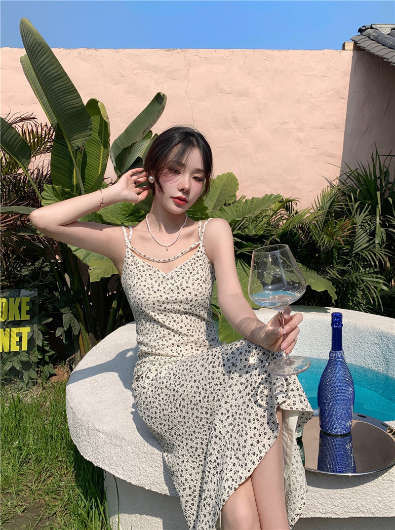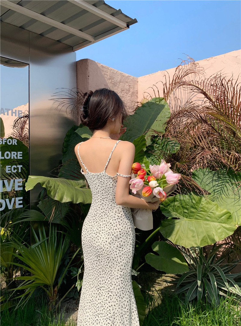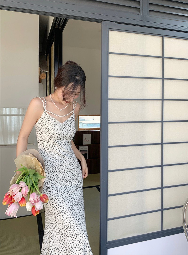 复古夏新款连衣裙长款修身鱼尾碎花裙V领轻熟风吊带裙女
