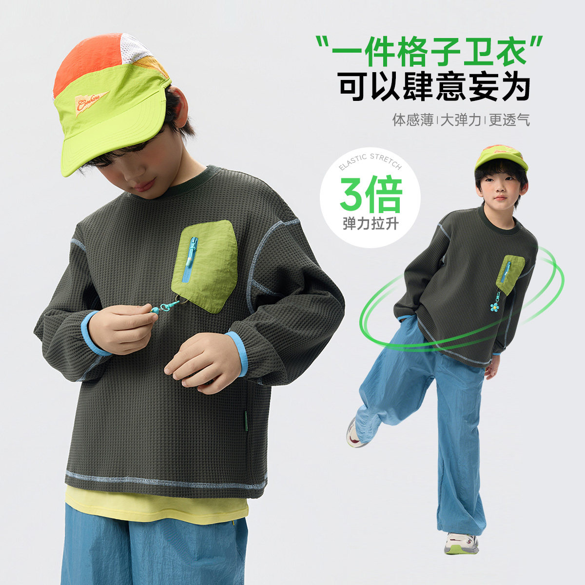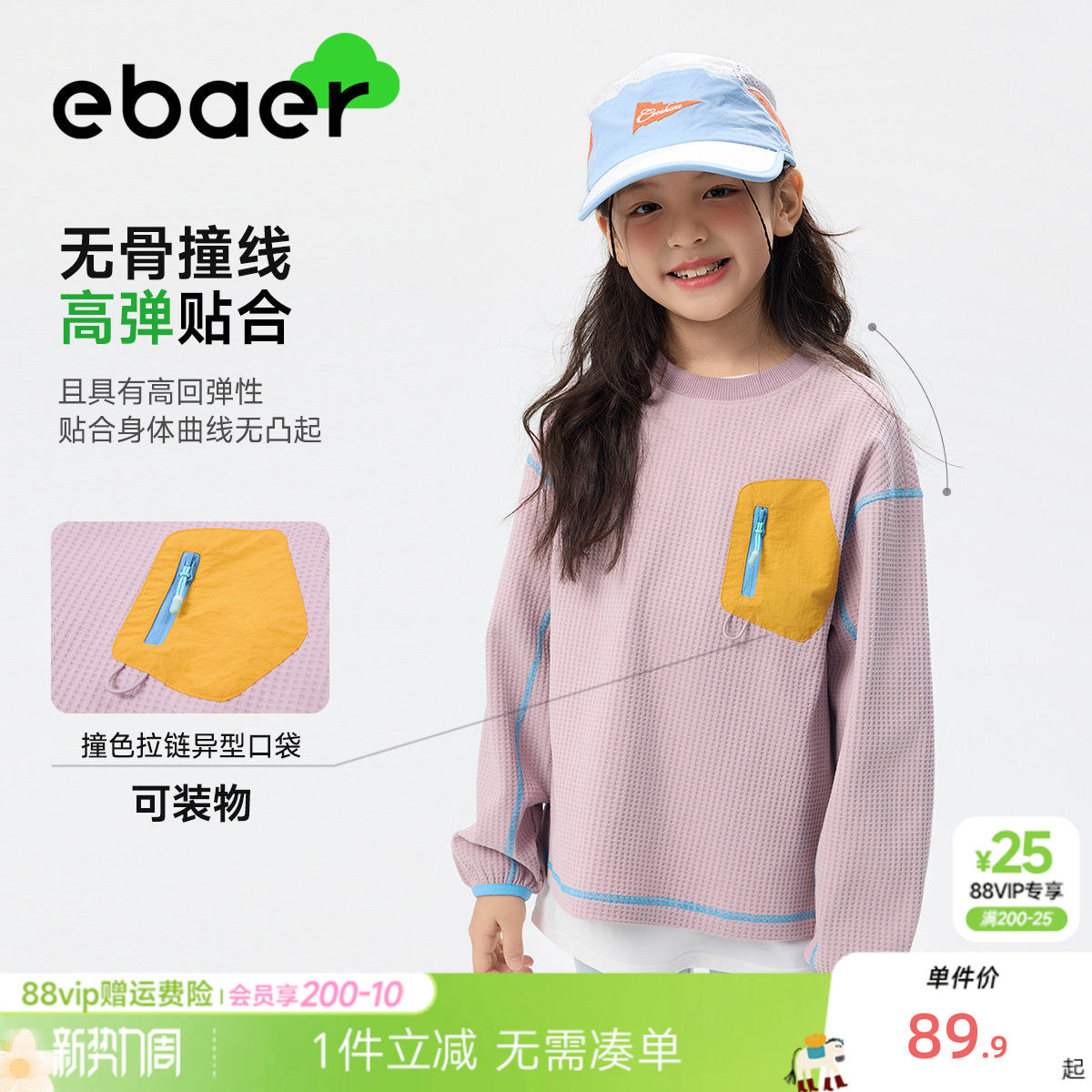 ebaer儿童运动卫衣2026春季新款男童撞色口袋T恤女童透气春装上衣