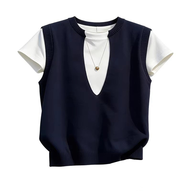 夏日ootd穿搭黑色假两件撞色短袖t恤女2026新款独特漂亮小众上衣