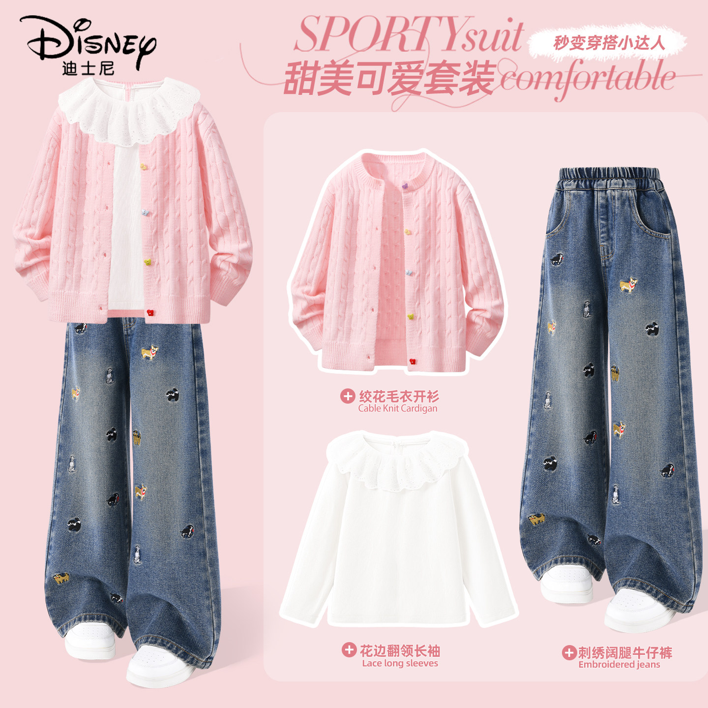 迪士尼女童春装套装2026新款红色过年毛衣休闲好看薄款儿童三件套