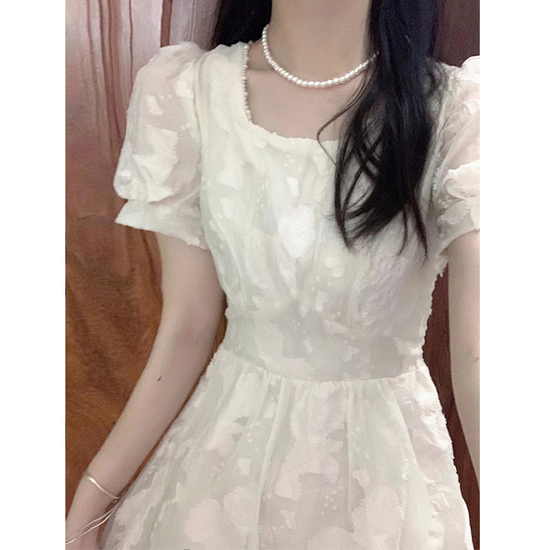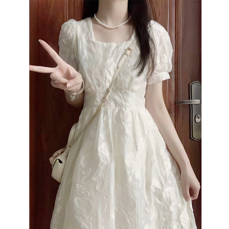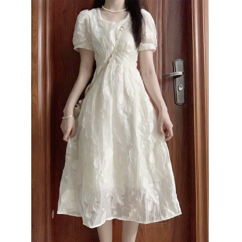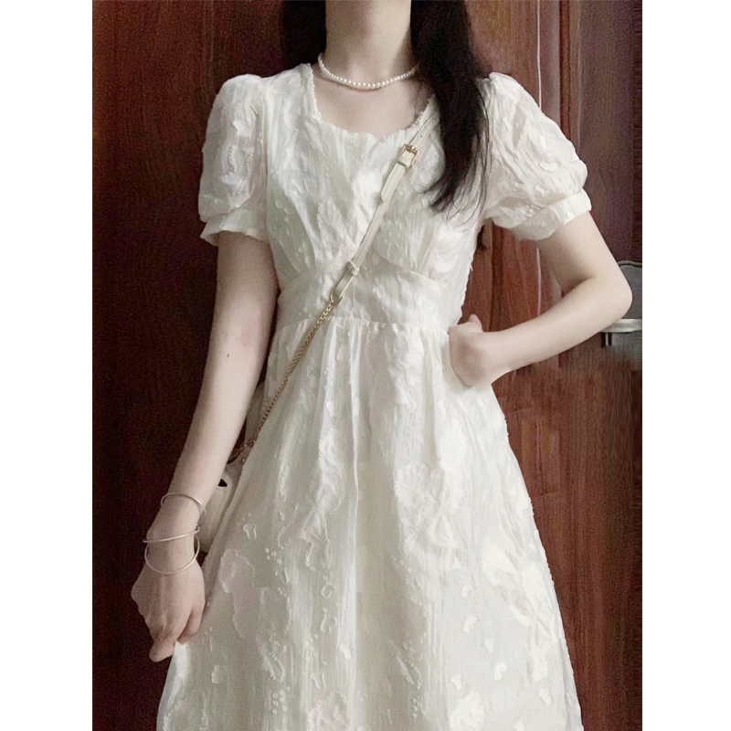 清仓!高级感白色连衣裙女夏季方领法式泡泡袖甜美收腰显瘦长裙