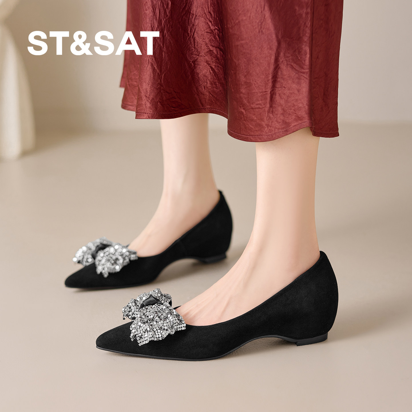 星期六浅口单鞋女2026新款法式绝美亮片蝴蝶结黑色尖头内增高女鞋