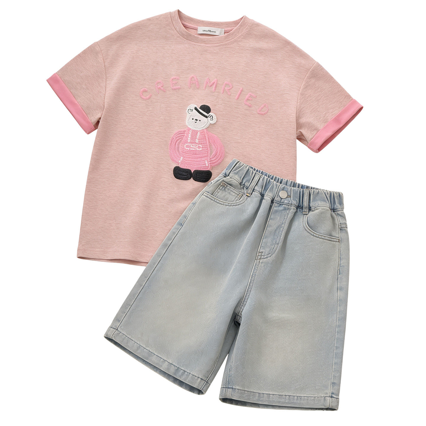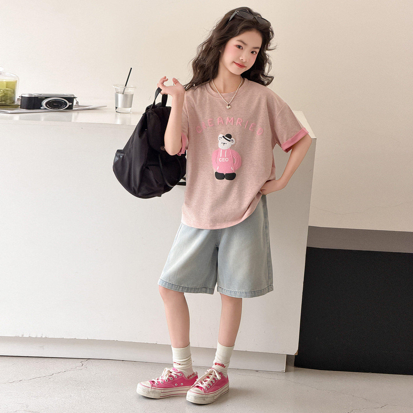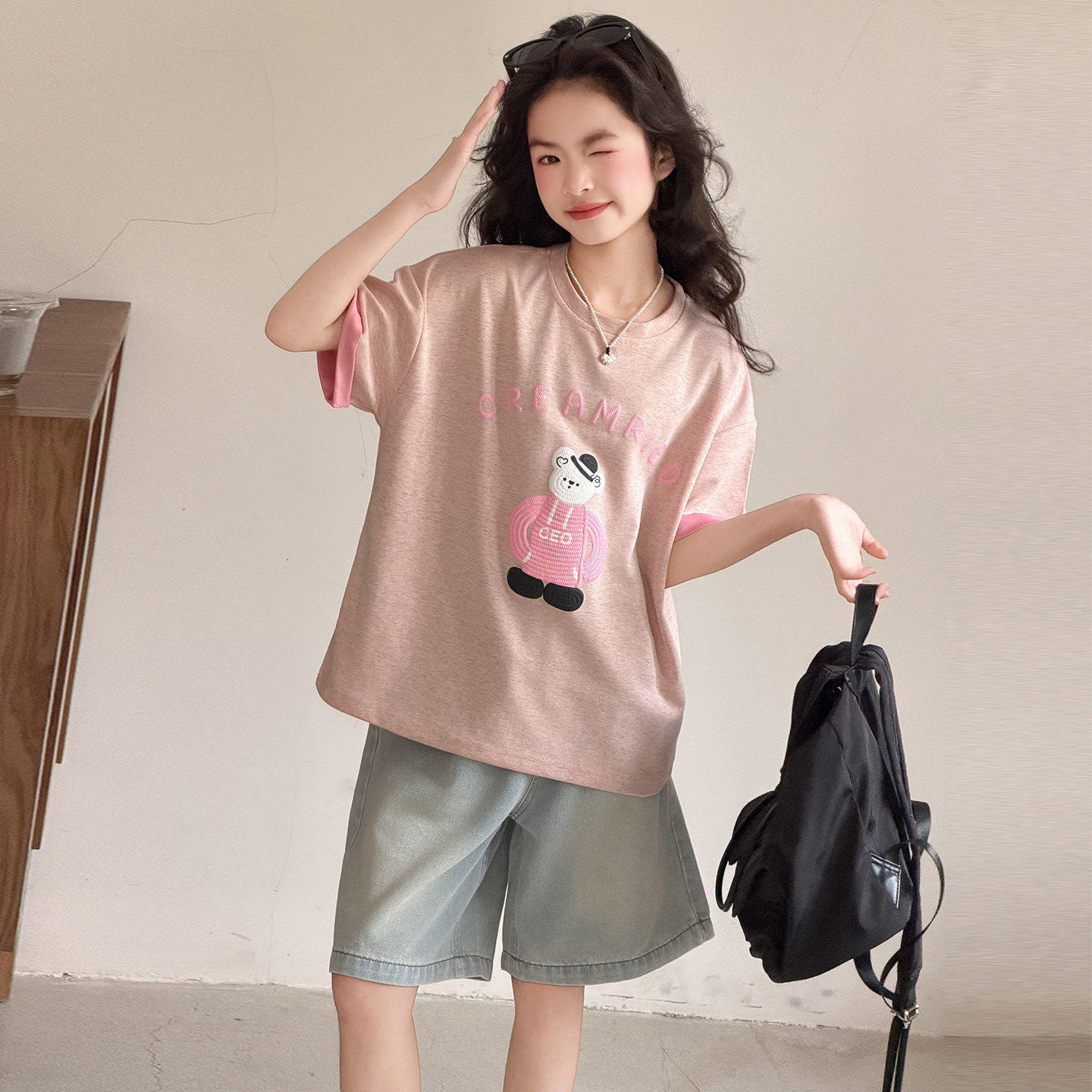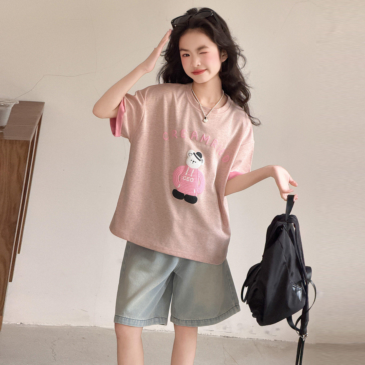 女童套装韩版可爱风小熊印花短袖T恤9女宽松圆领休闲上衣夏季薄款