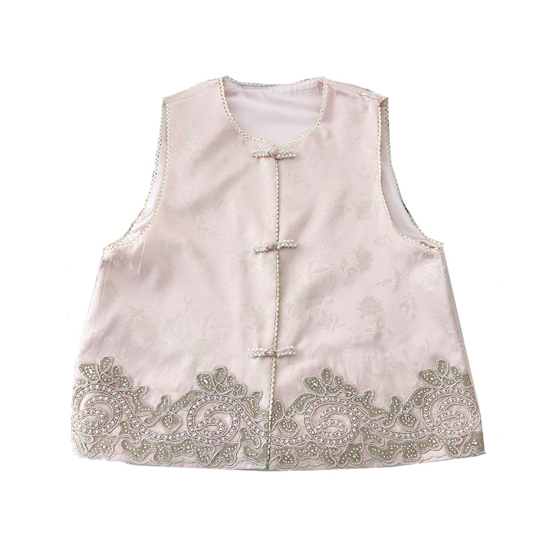 高级感国风钉珠提花盘扣马甲女春装打底衫缎面半身裙新中式三件套