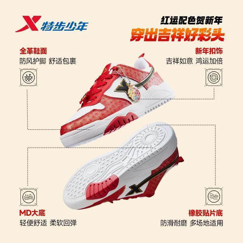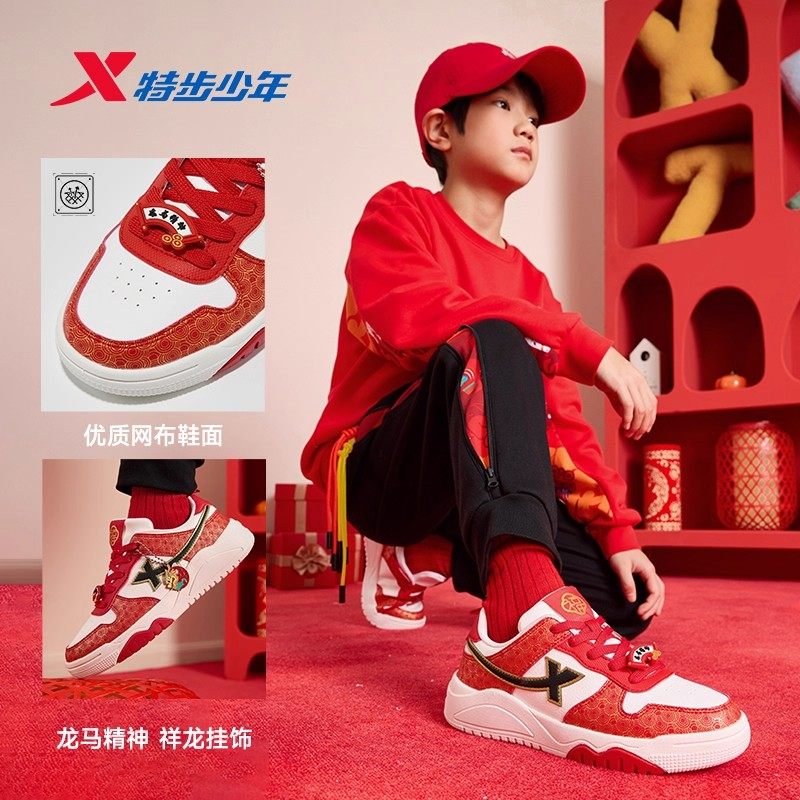 福燈贺岁|特步板鞋男女童红色新款时尚百搭休闲鞋轻便保暖运动鞋
