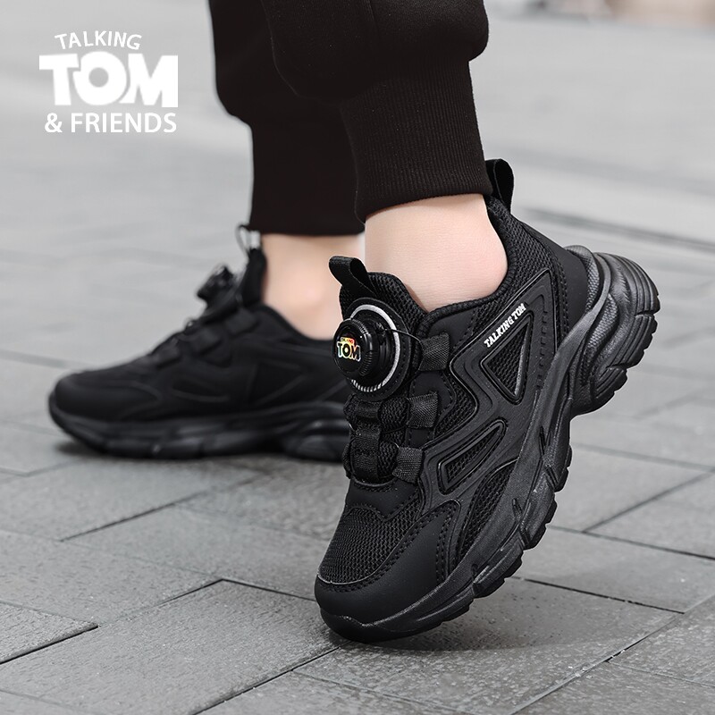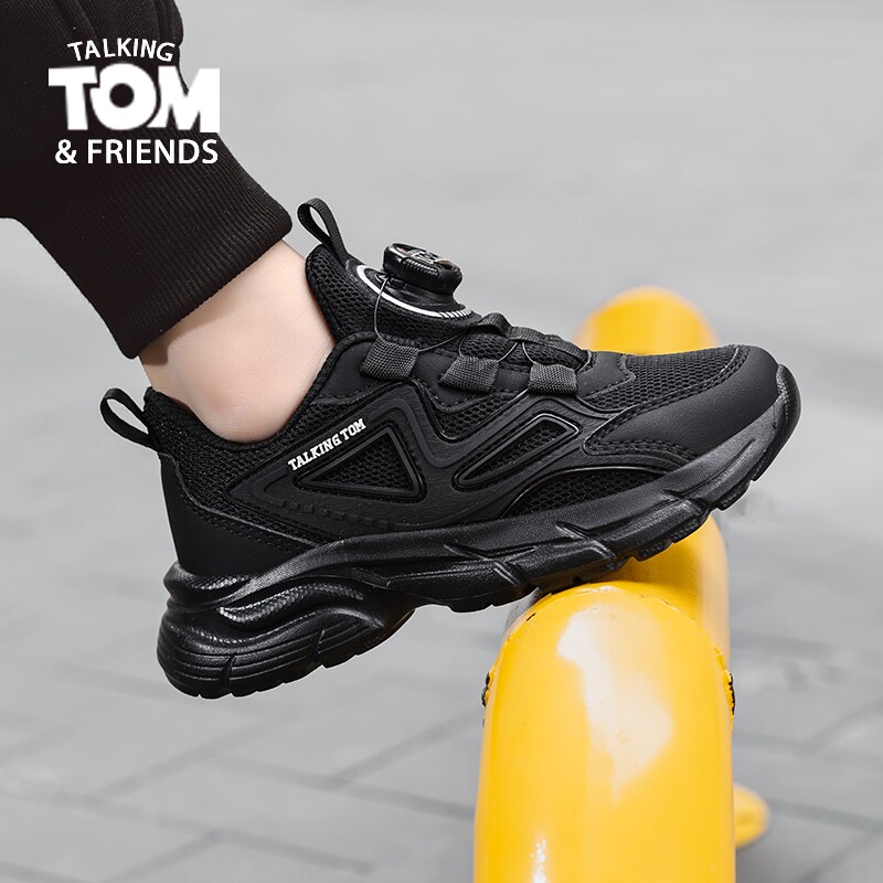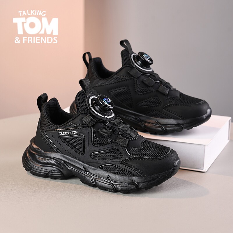 汤姆猫儿童小黑鞋夏季新款网面透气男童黑色运动鞋旋转纽扣女童鞋