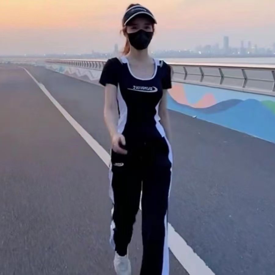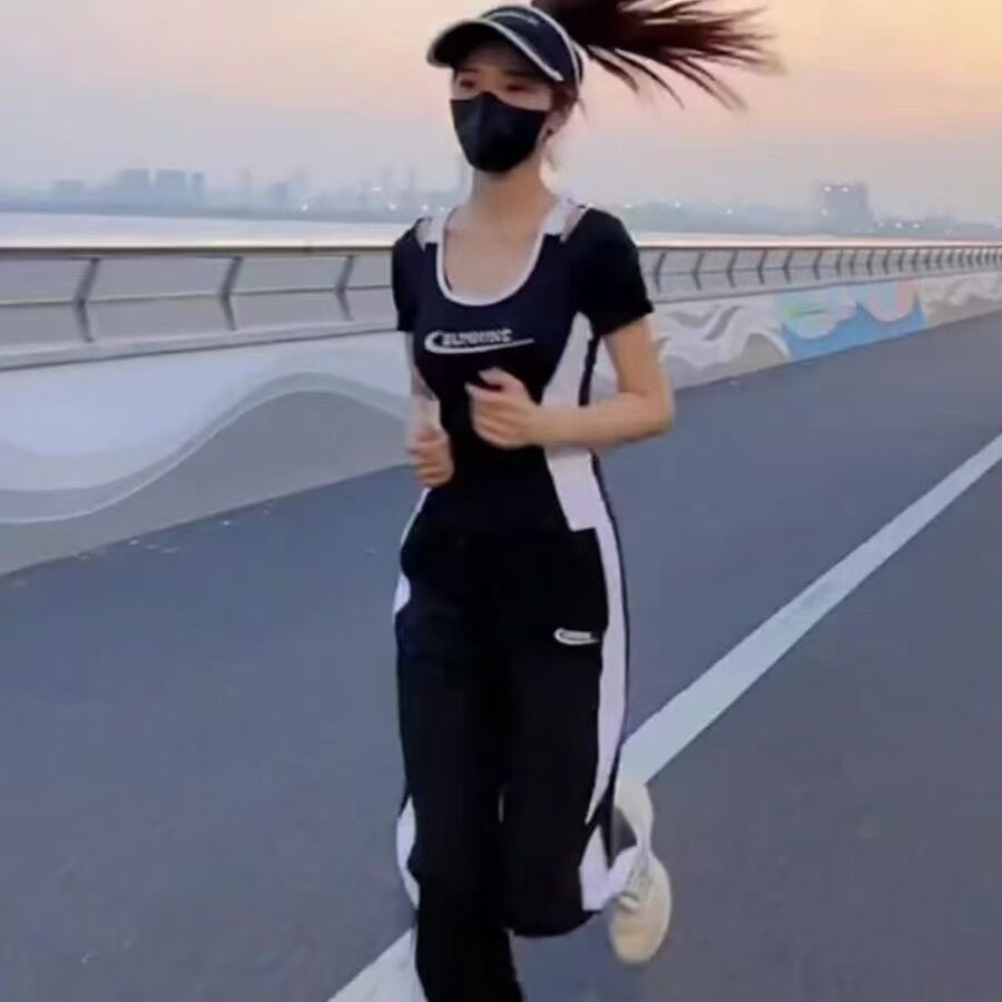 黑色跑步运动套装女2026夏季新款短袖晨跑两件套时尚休闲运动套装