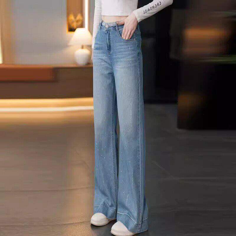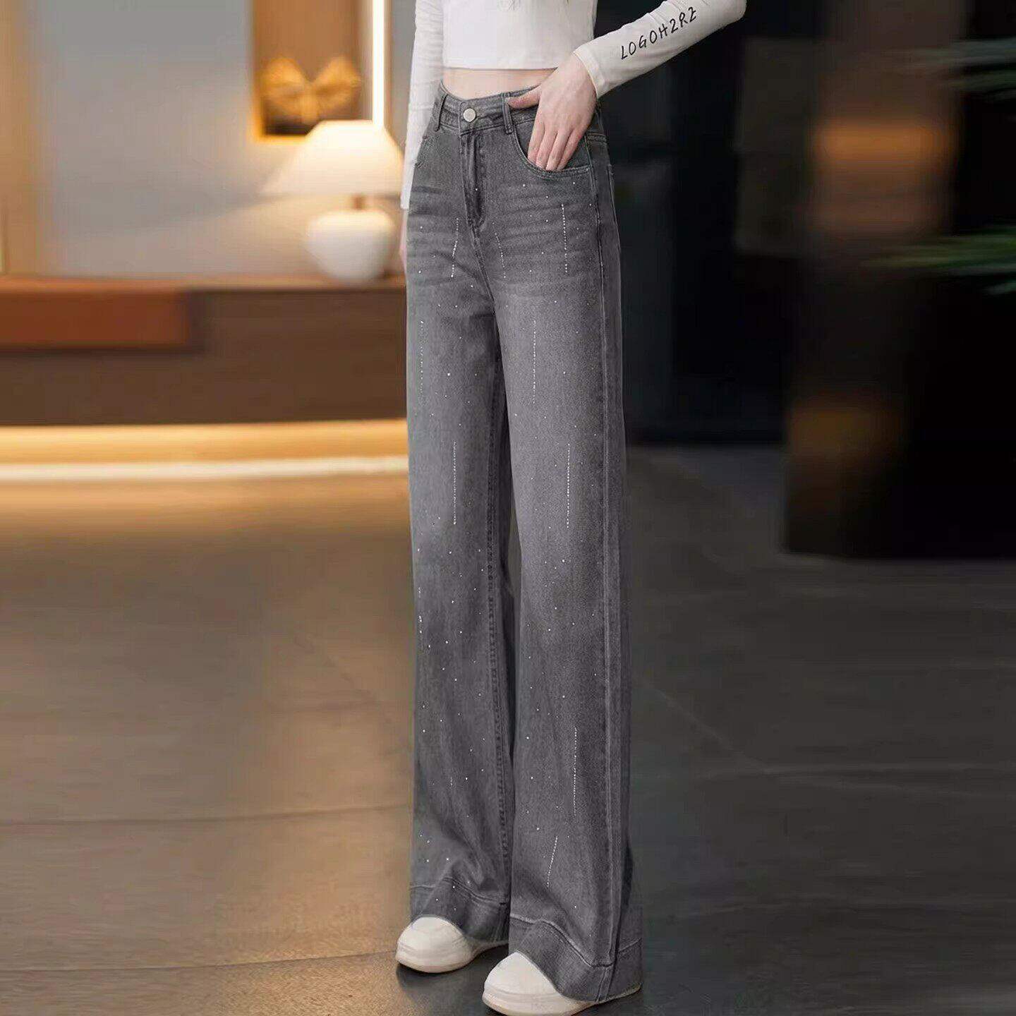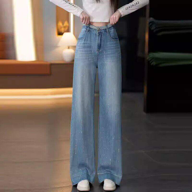 烫钻蓝色休闲牛仔裤女2026新款春季宽松显瘦女款直筒垂感阔腿裤子