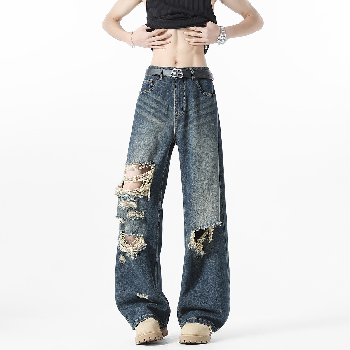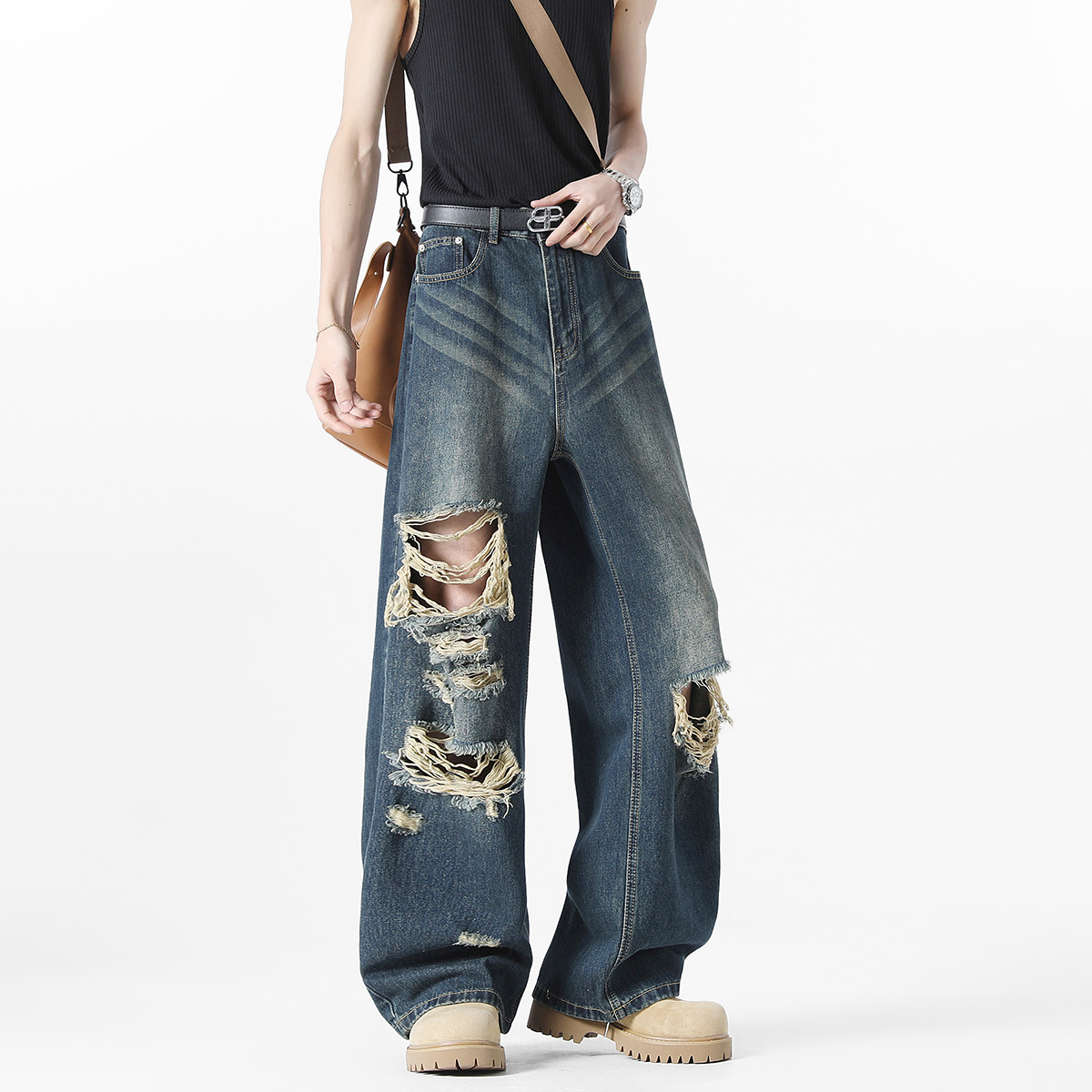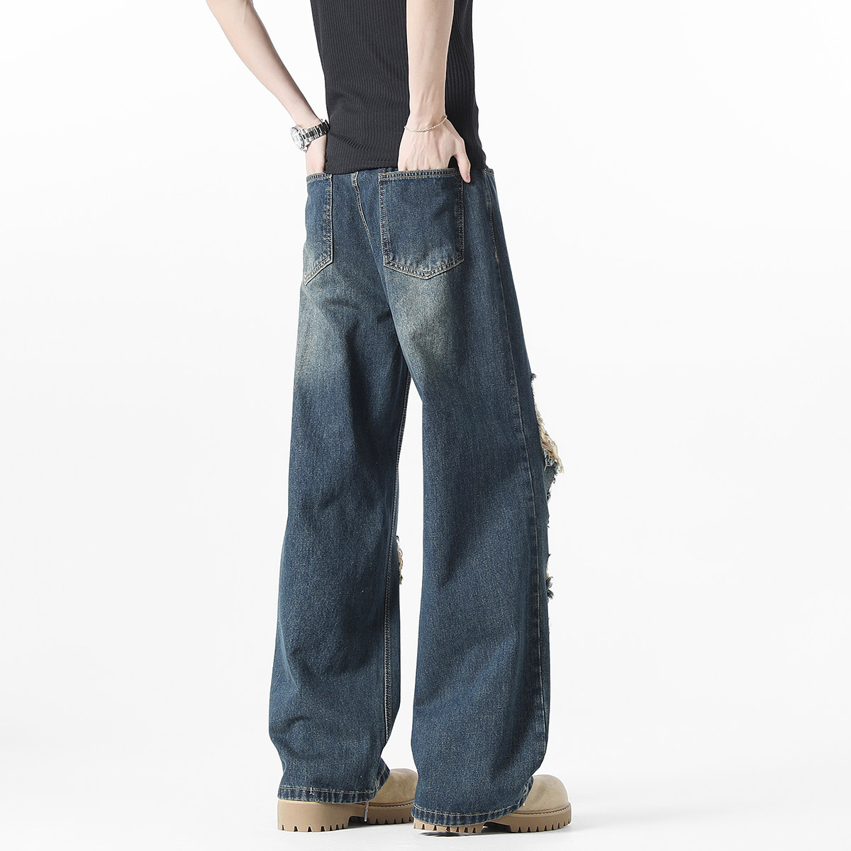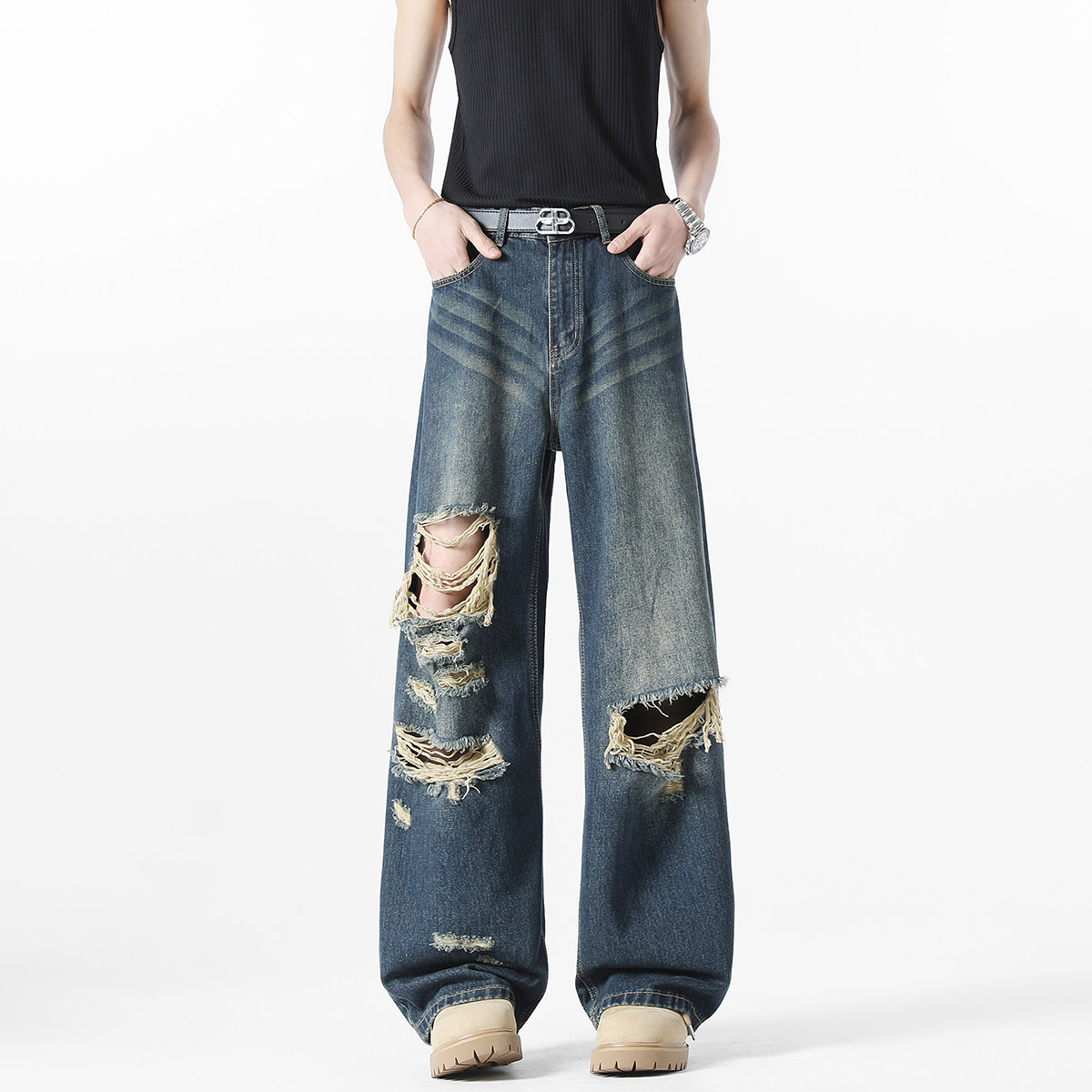 V37美式破洞牛仔裤男款2026春季新款水洗做旧复古百搭直筒长裤子