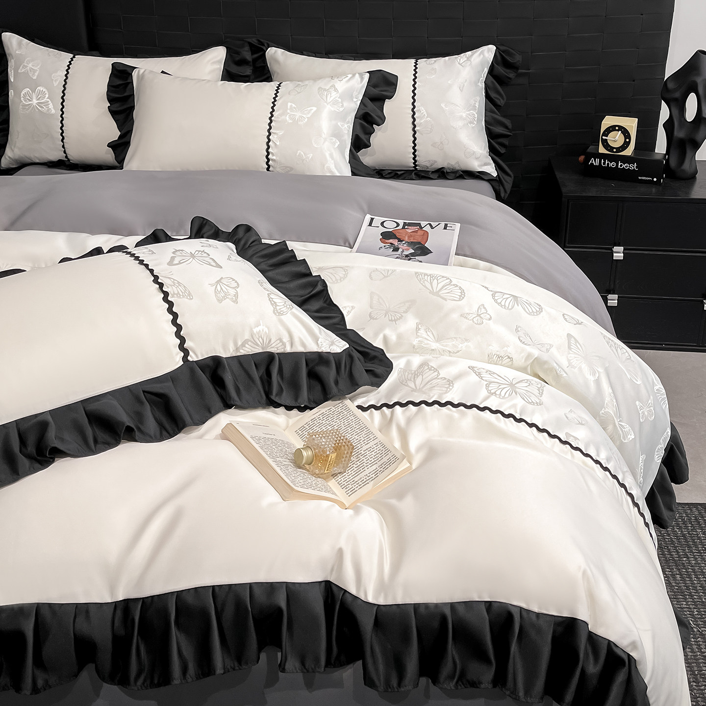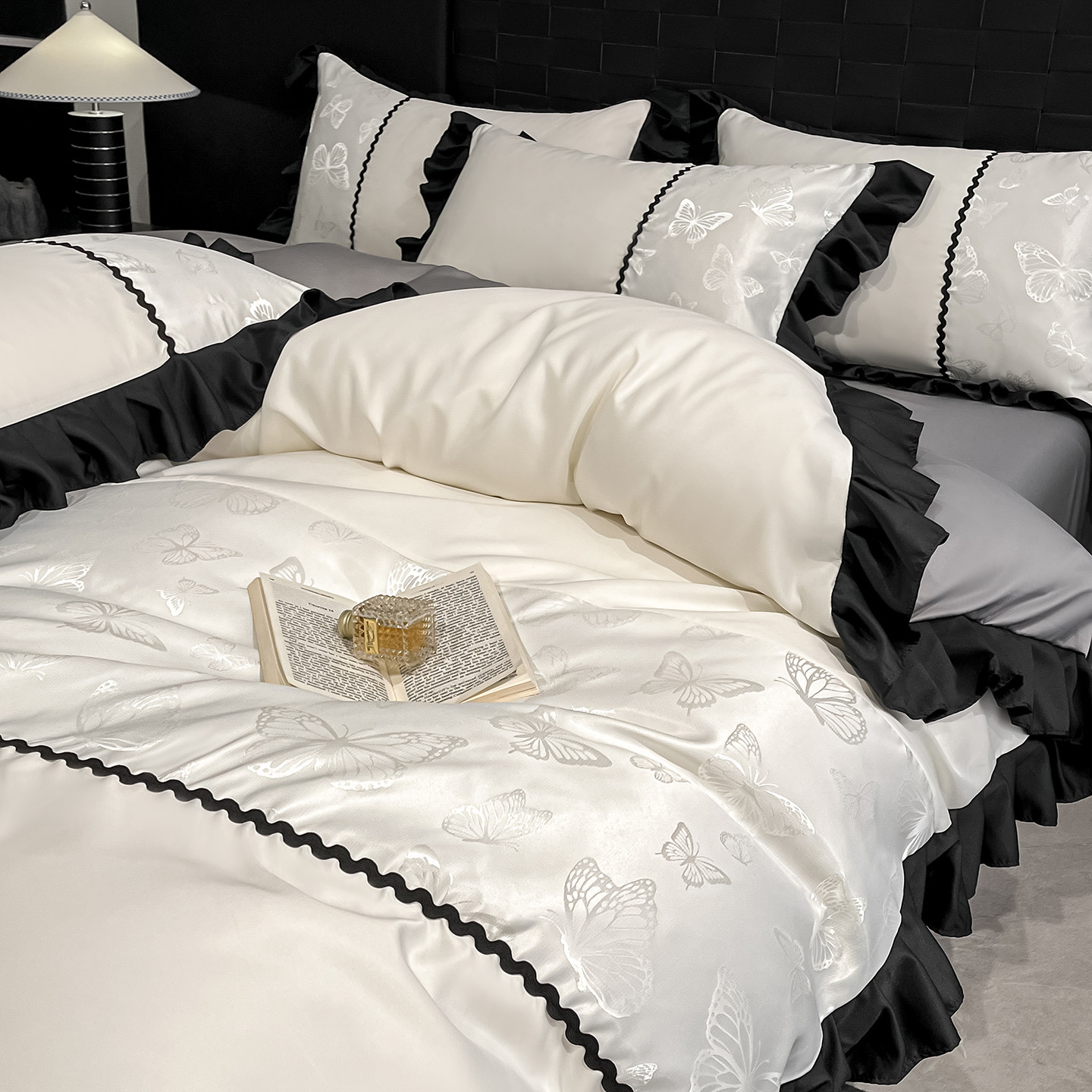 夏季2026款水洗真丝提花四件套冰丝花边被套纯色床单床笠款床品4