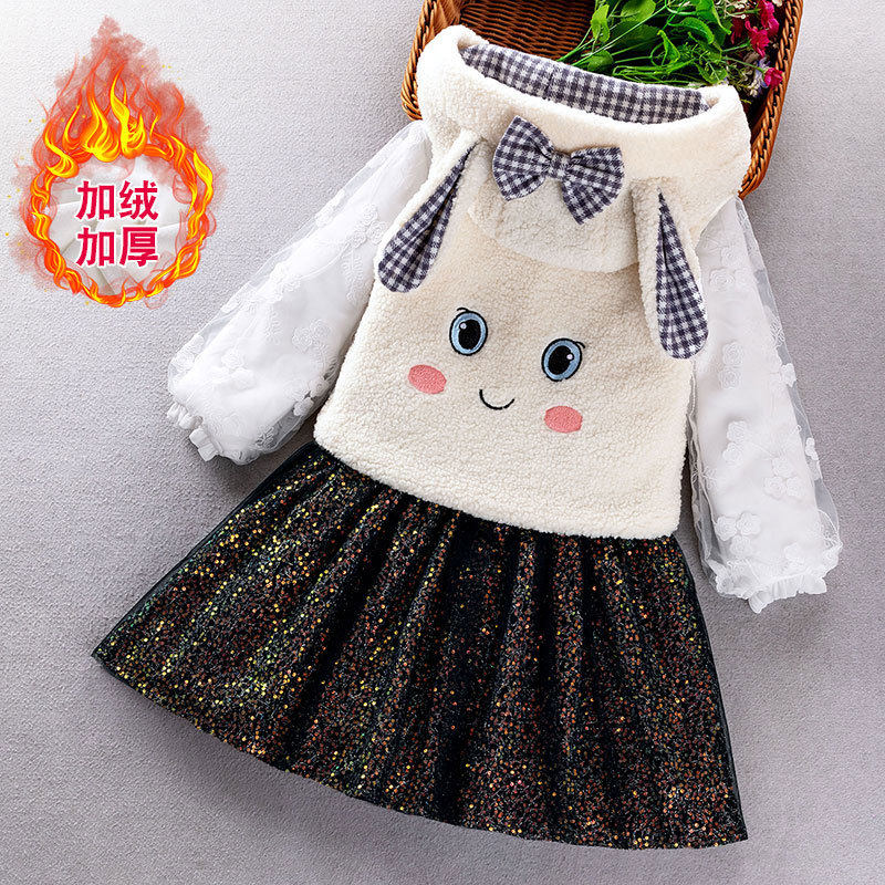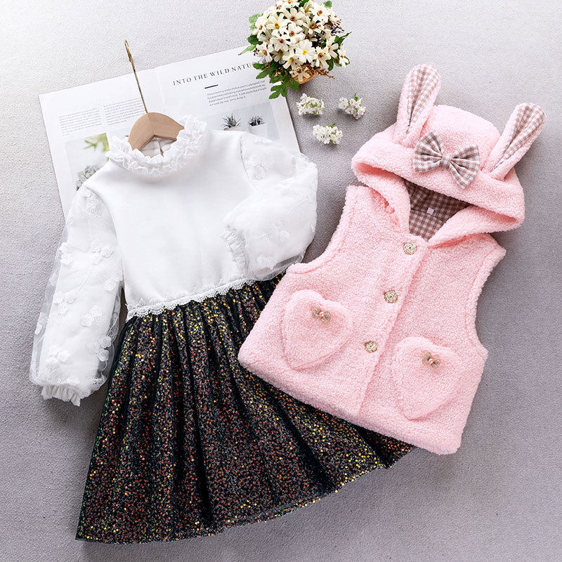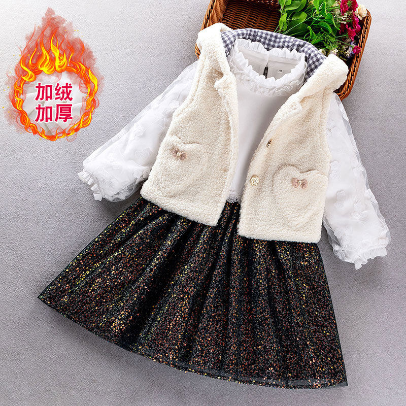 女童秋冬套装连衣裙儿童呢子背心连帽外套宝宝秋冬加厚加绒两件套