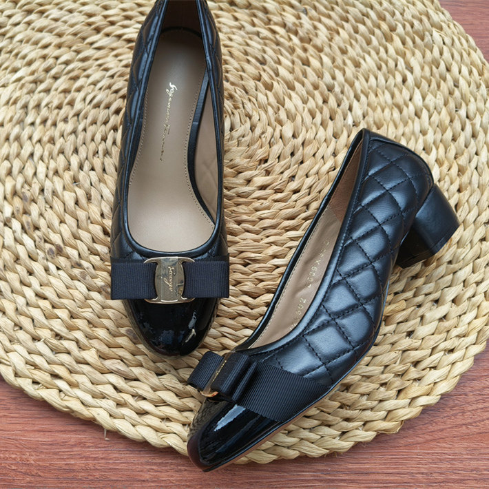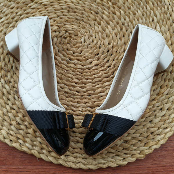 欧美蝴蝶结小香风菱格通勤日常休闲全真皮浅口中跟女鞋单鞋 船鞋