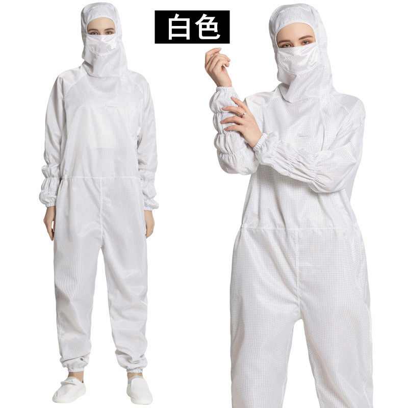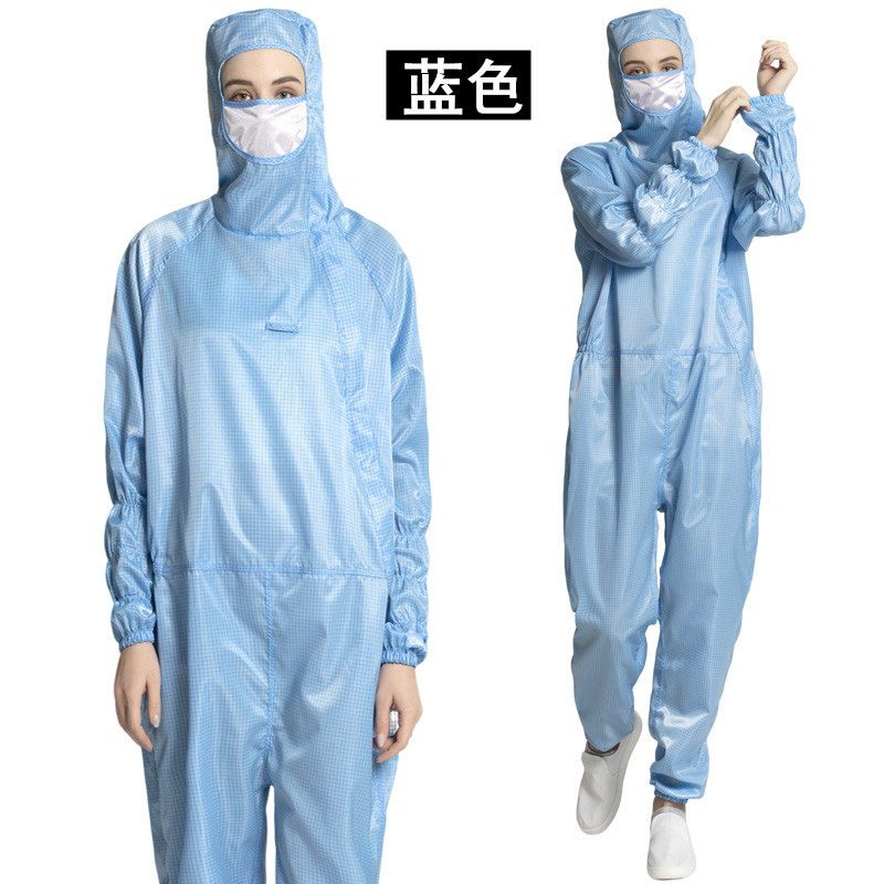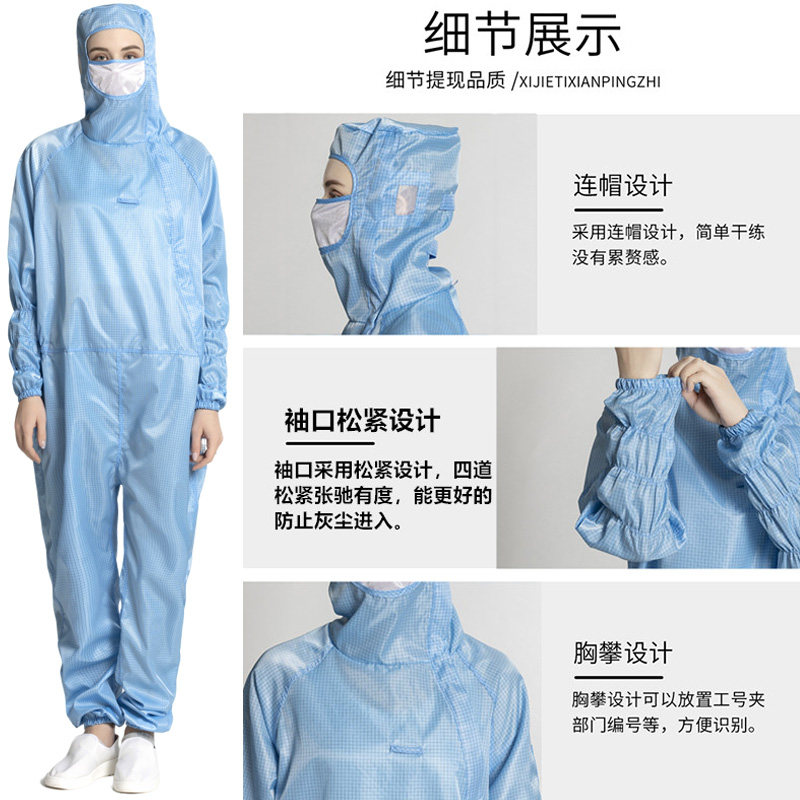 防尘服斜拉链百级防静电网格连帽连体服带面罩净化车间无尘工作服