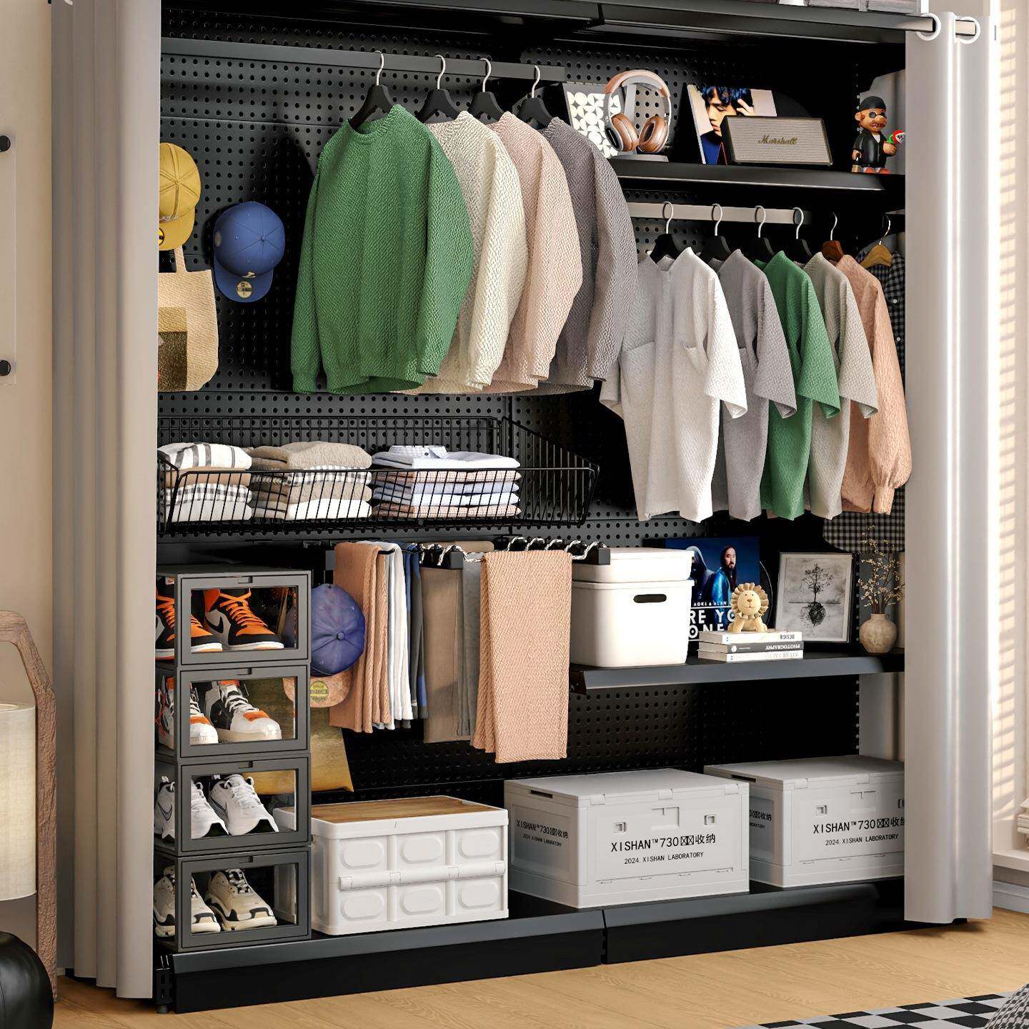 洞洞板简易组装五金柜金属衣橱开放w式带防尘帘0.16开放衣式帽间