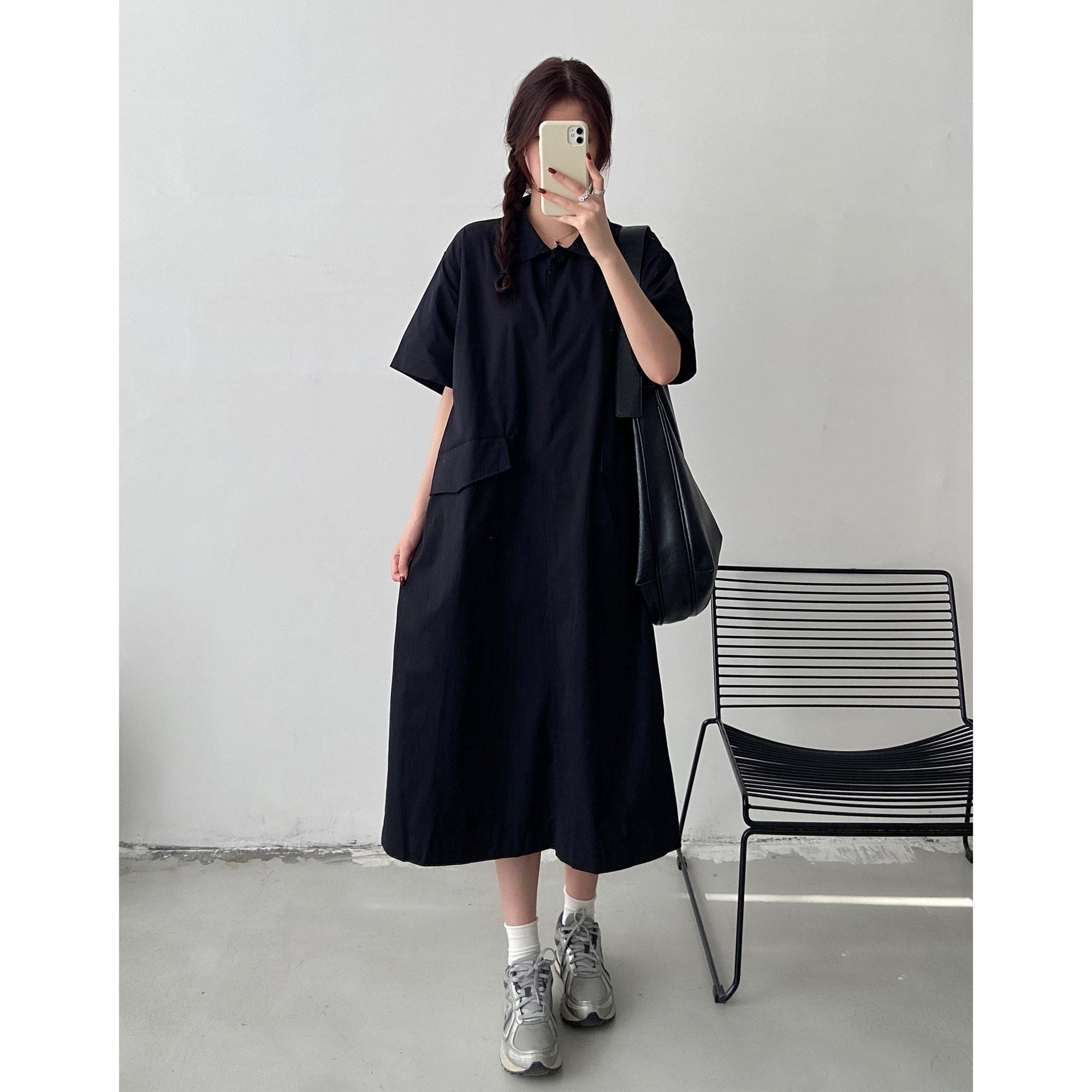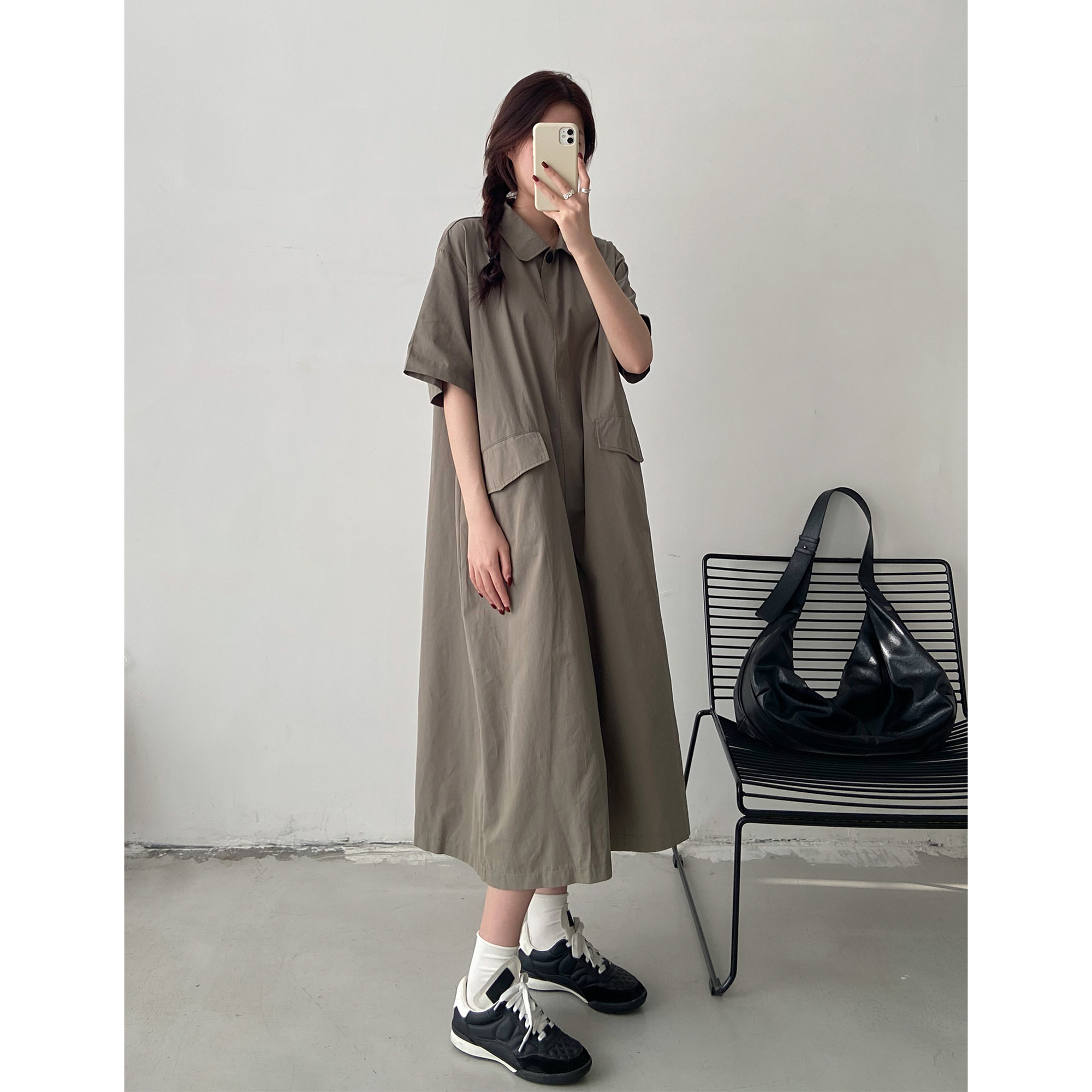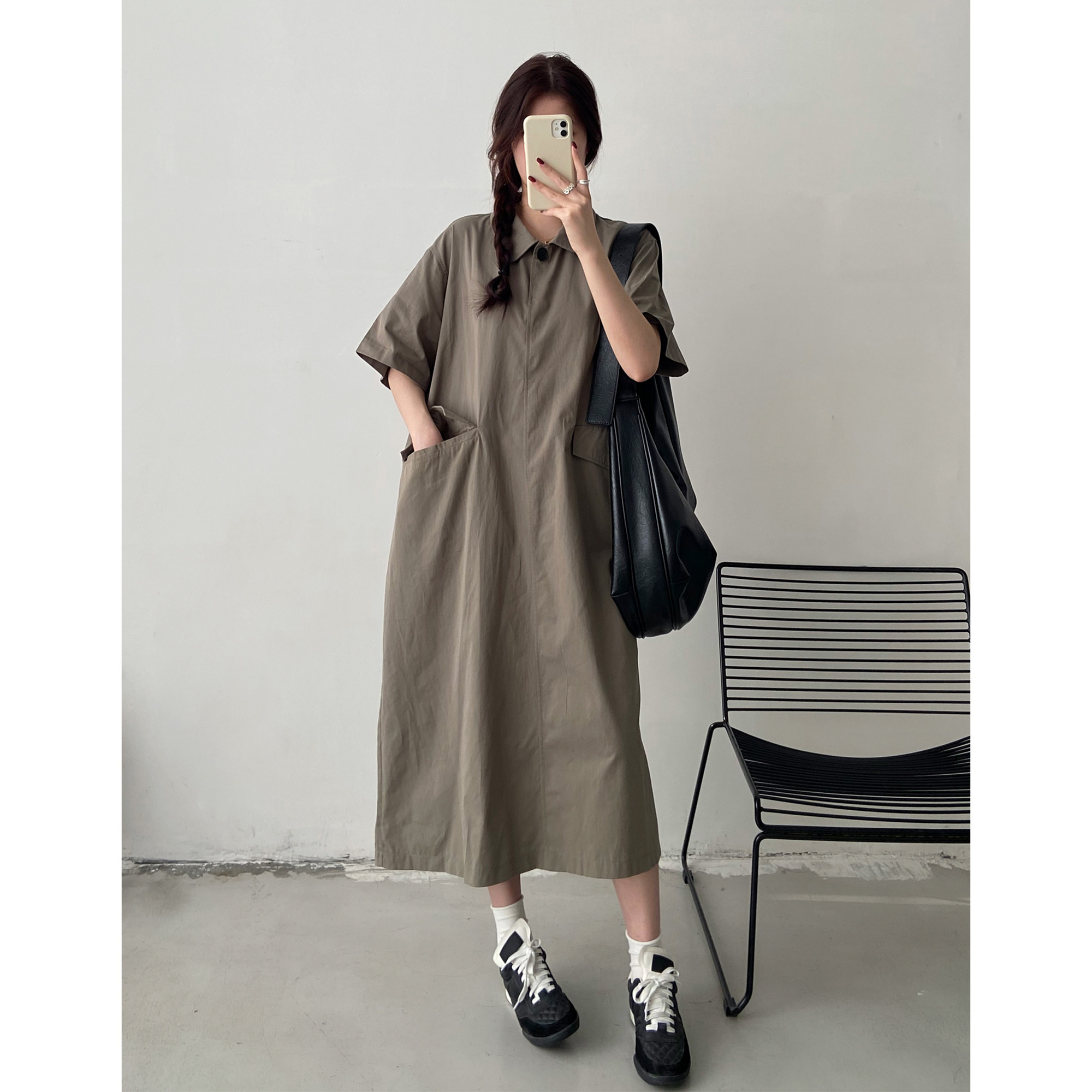 夏季新款大码连衣裙女胖mm宽松显瘦polo领工装风大口袋短袖长裙子
