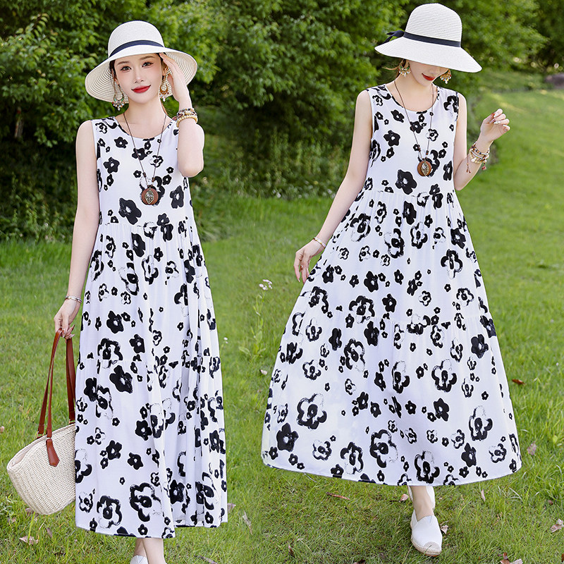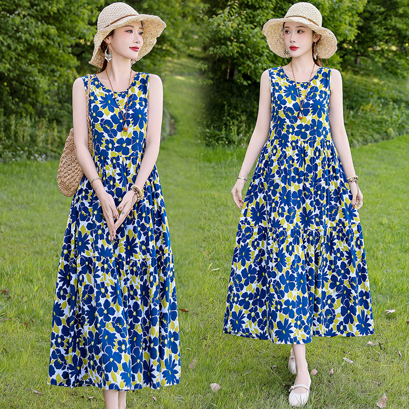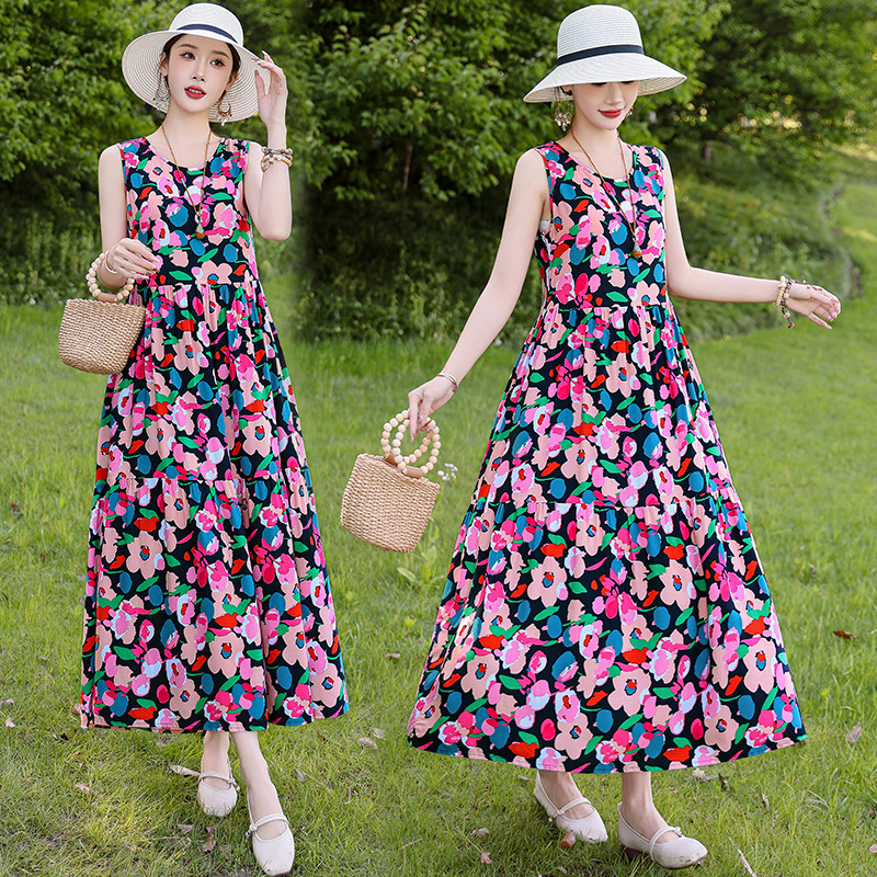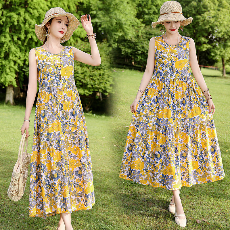高档时尚棉绸连衣裙女中长款绵绸妈妈背心裙减龄沙滩裙高级感长裙