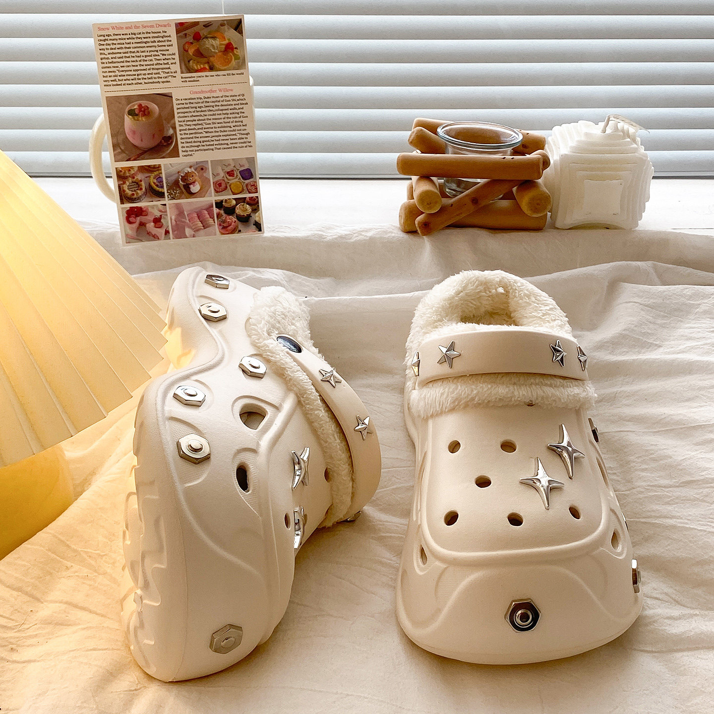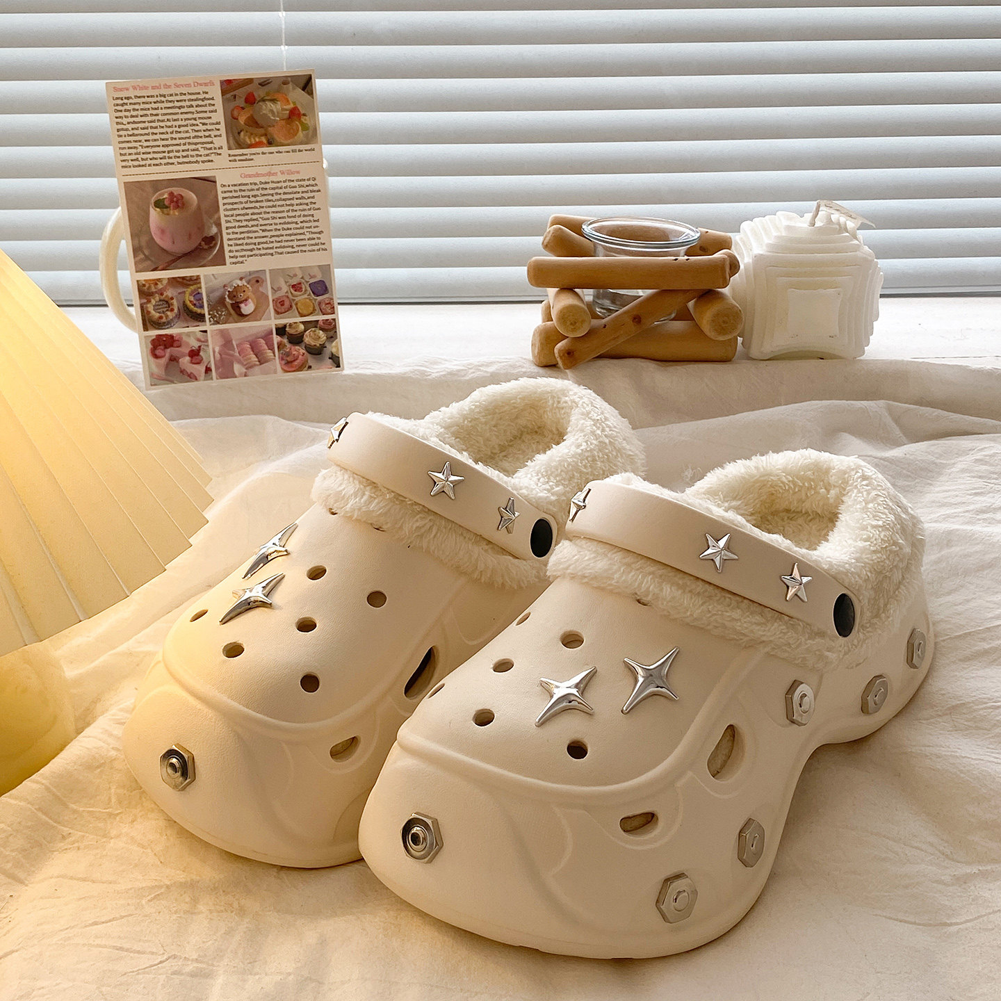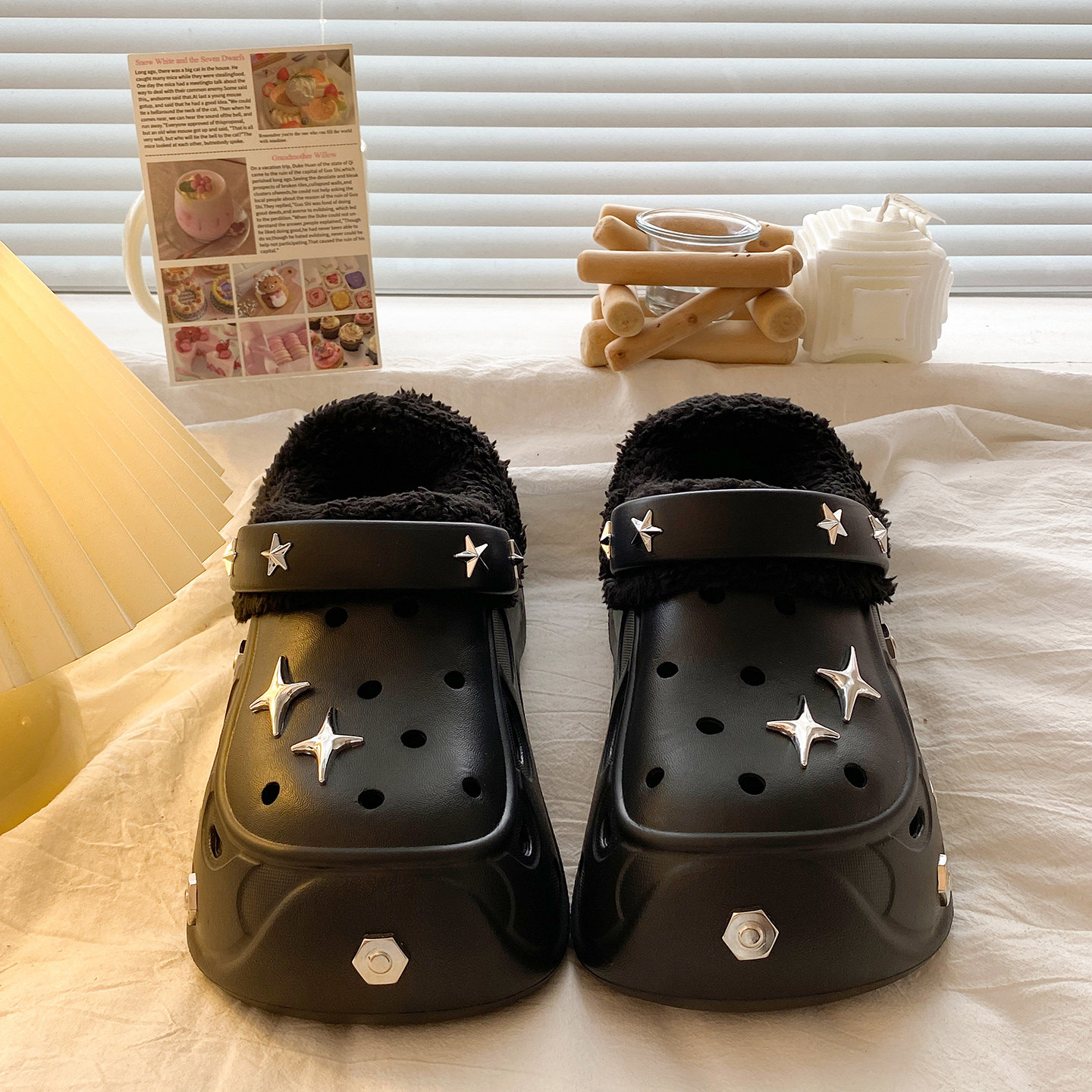 Y2k铆钉~秋冬洞洞鞋女外穿防滑厚底增高加绒保暖可拆卸包头棉拖鞋