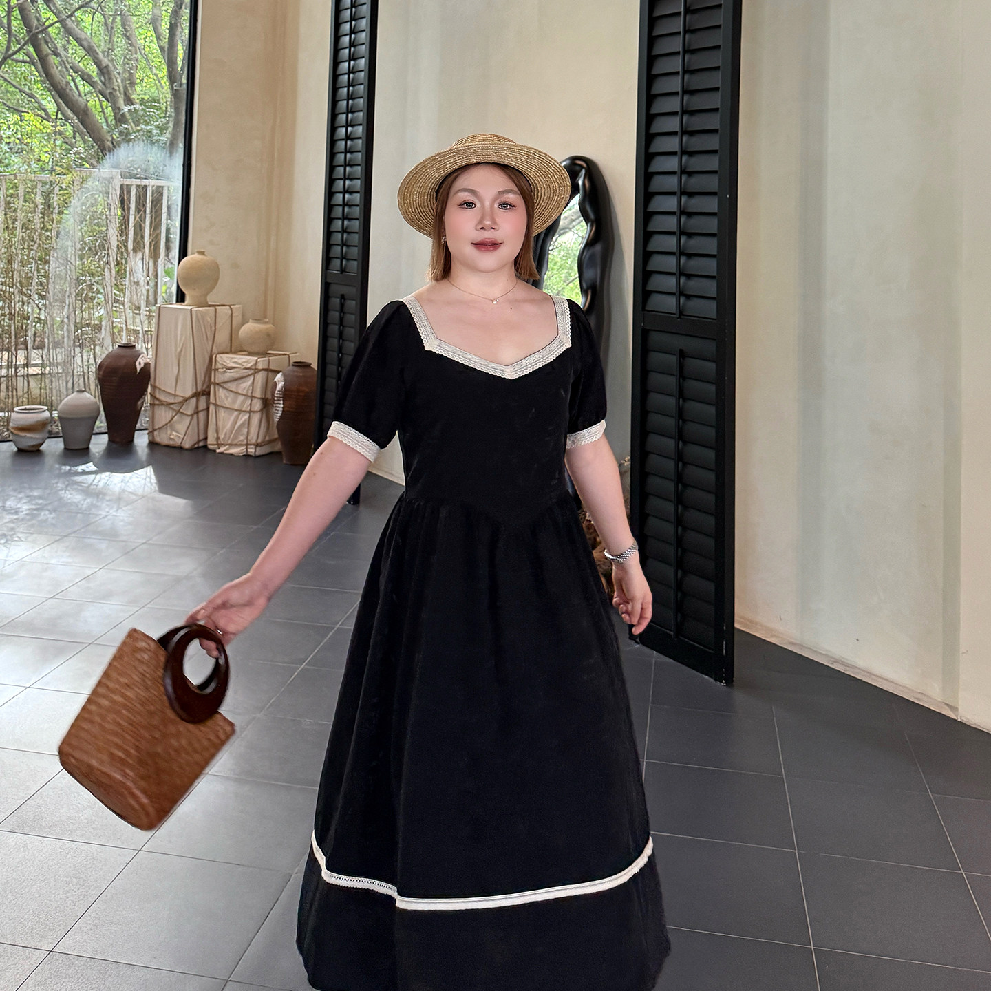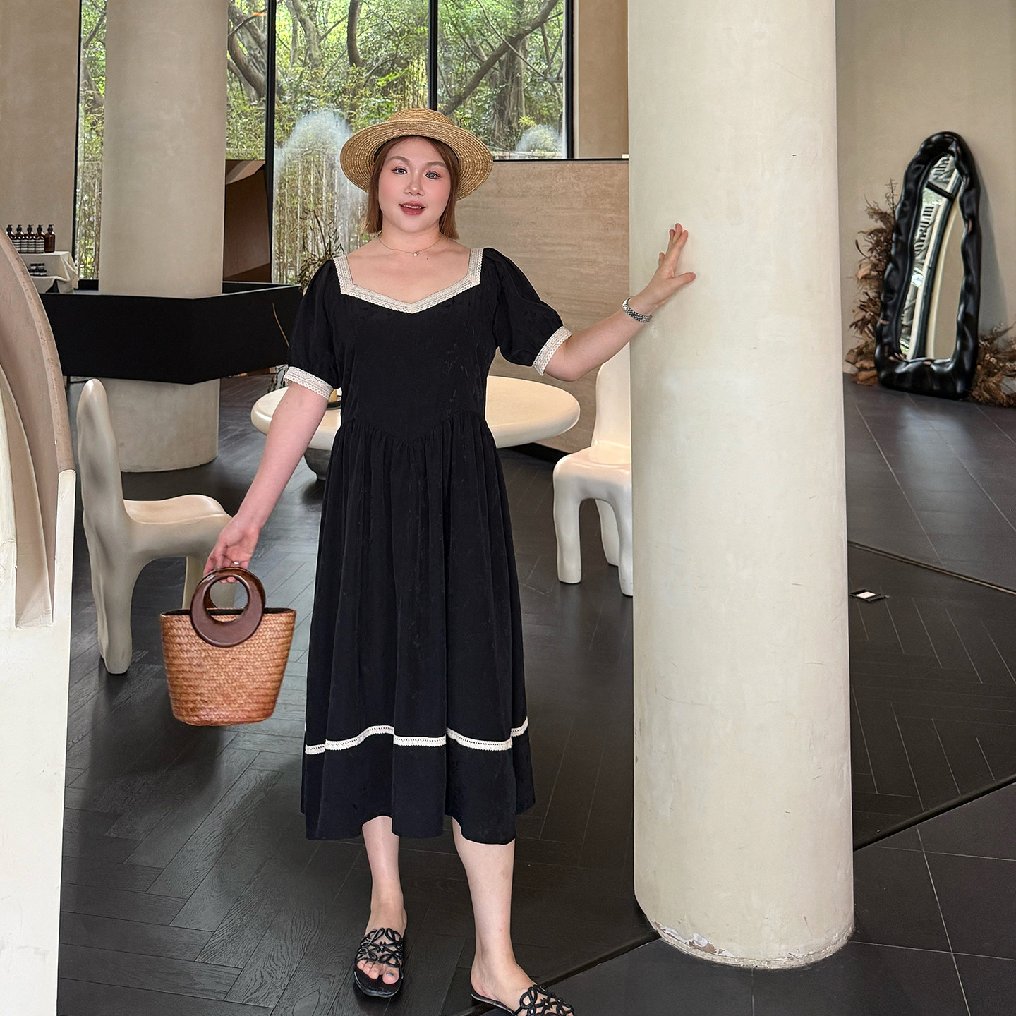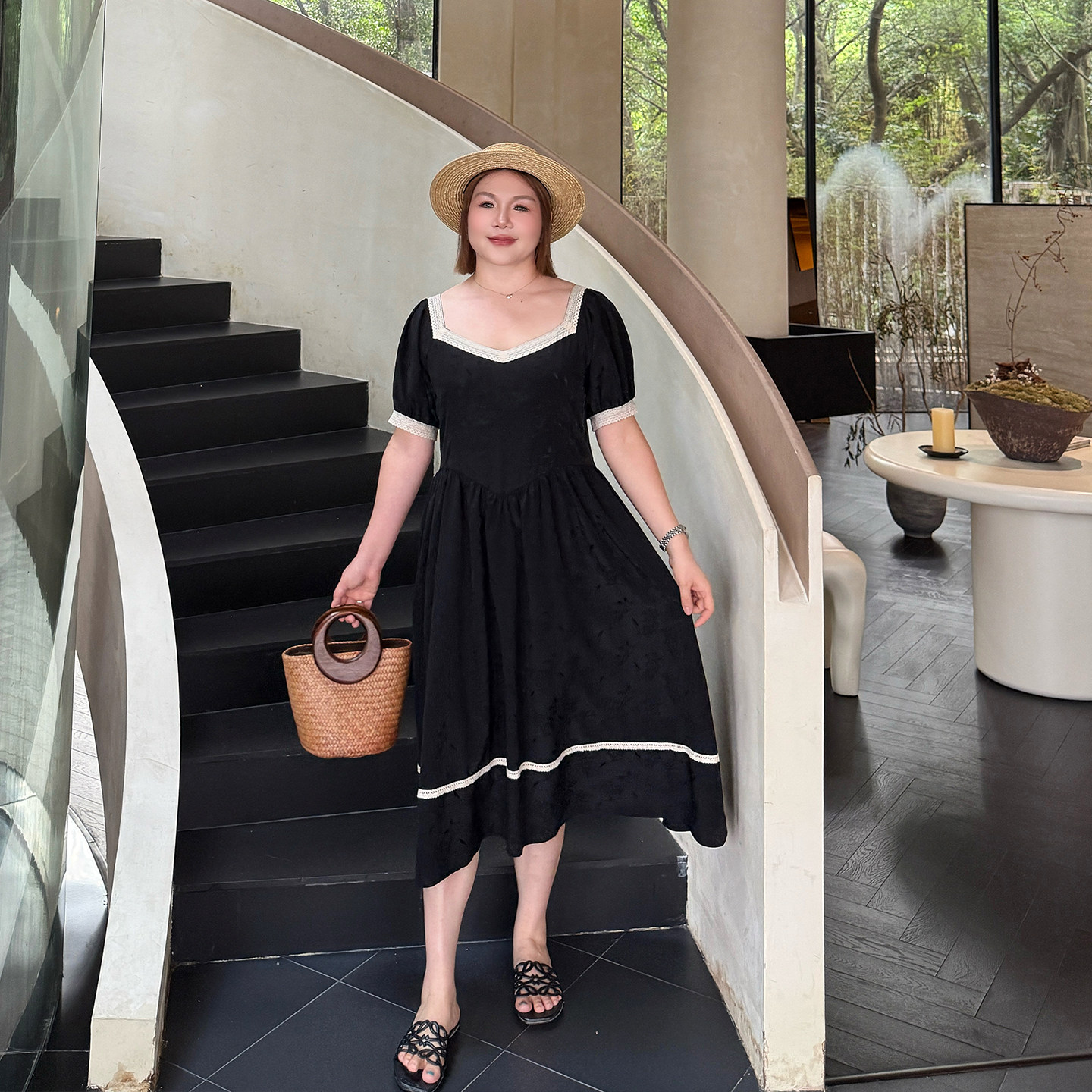 巨显瘦法式暗花收腰裙特大码女装胖mm夏季遮肚子复古方领连衣裙
