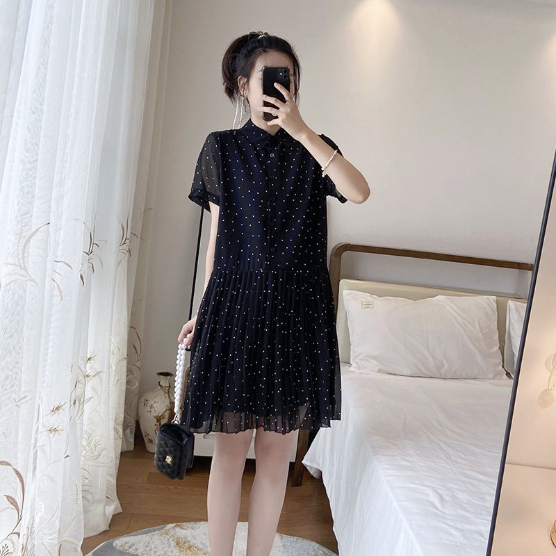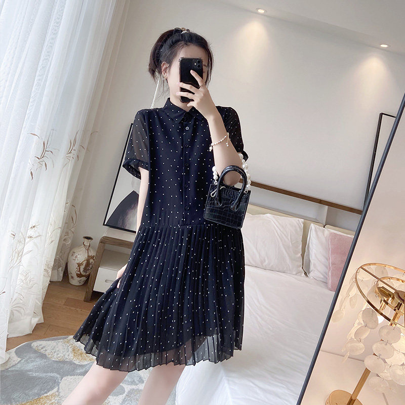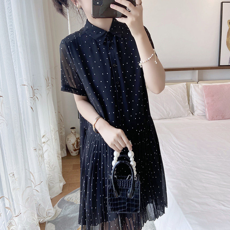 波点百褶宽松大码显瘦胖mm新款夏2025裙子遮肚微胖连衣裙polo雪纺