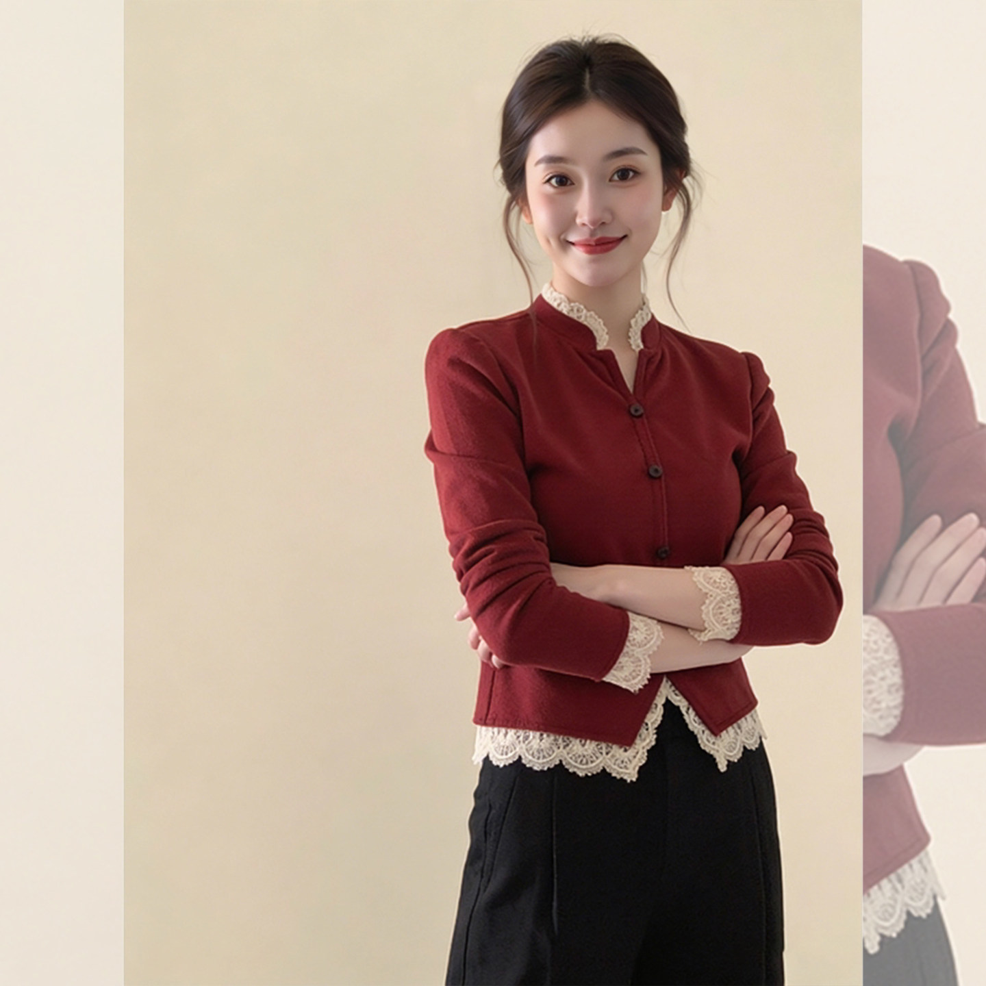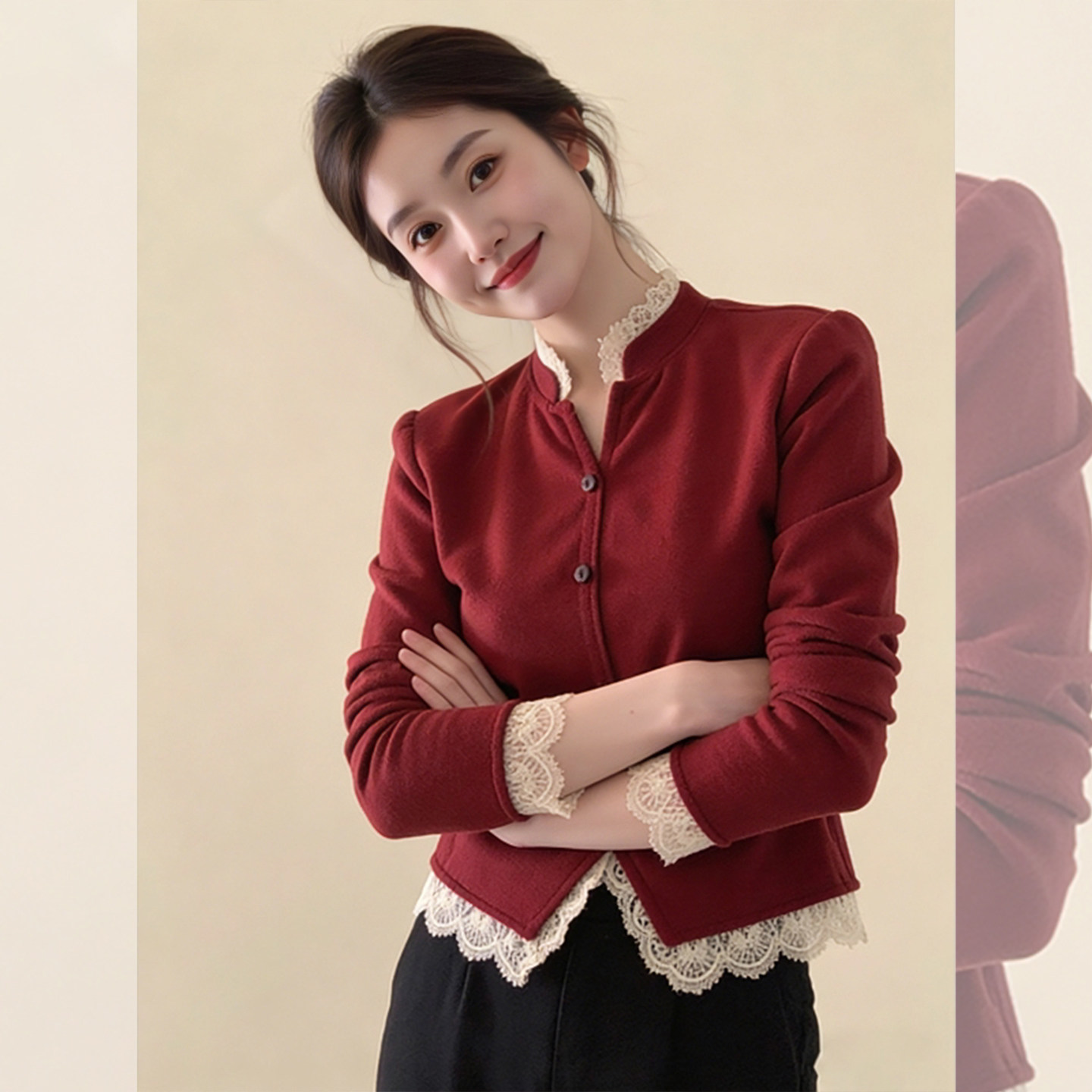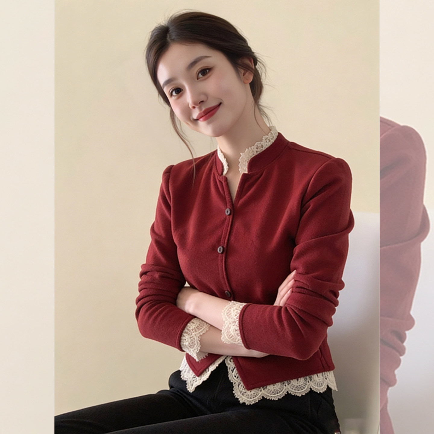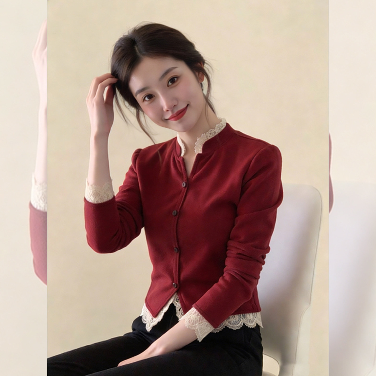 红运新辰~春季红色蕾丝拼接上衣2026新款立领单排扣修身衬衫女款