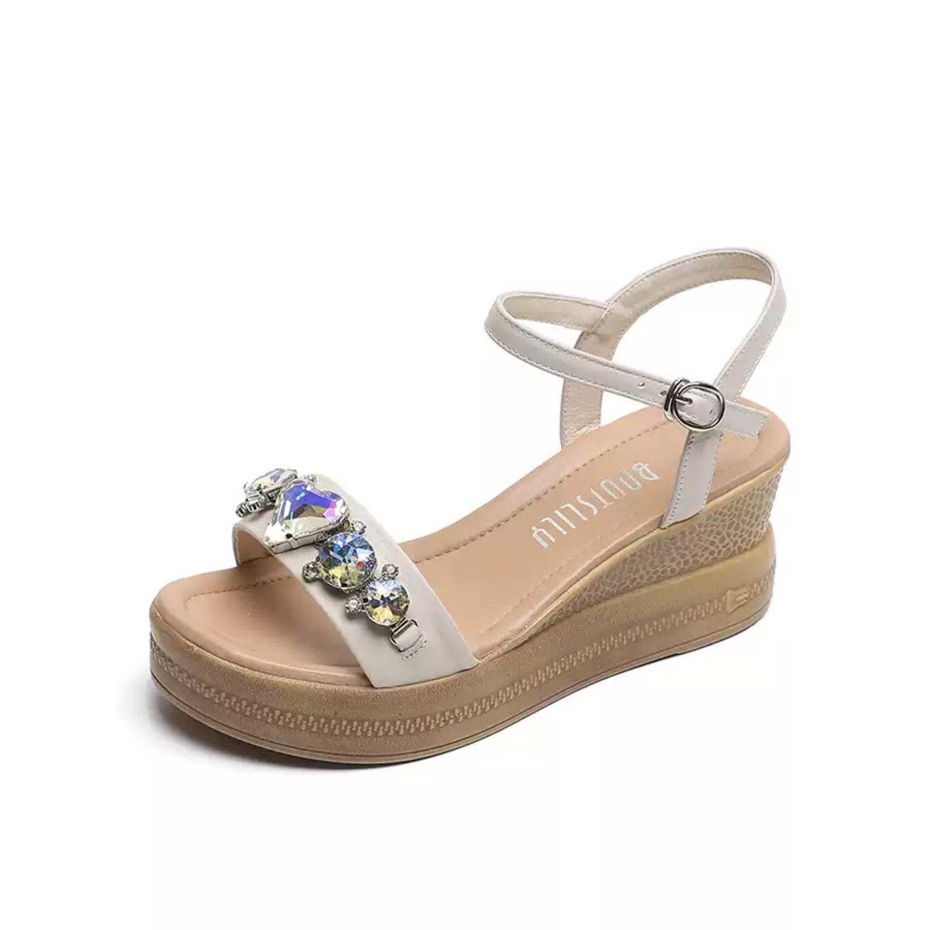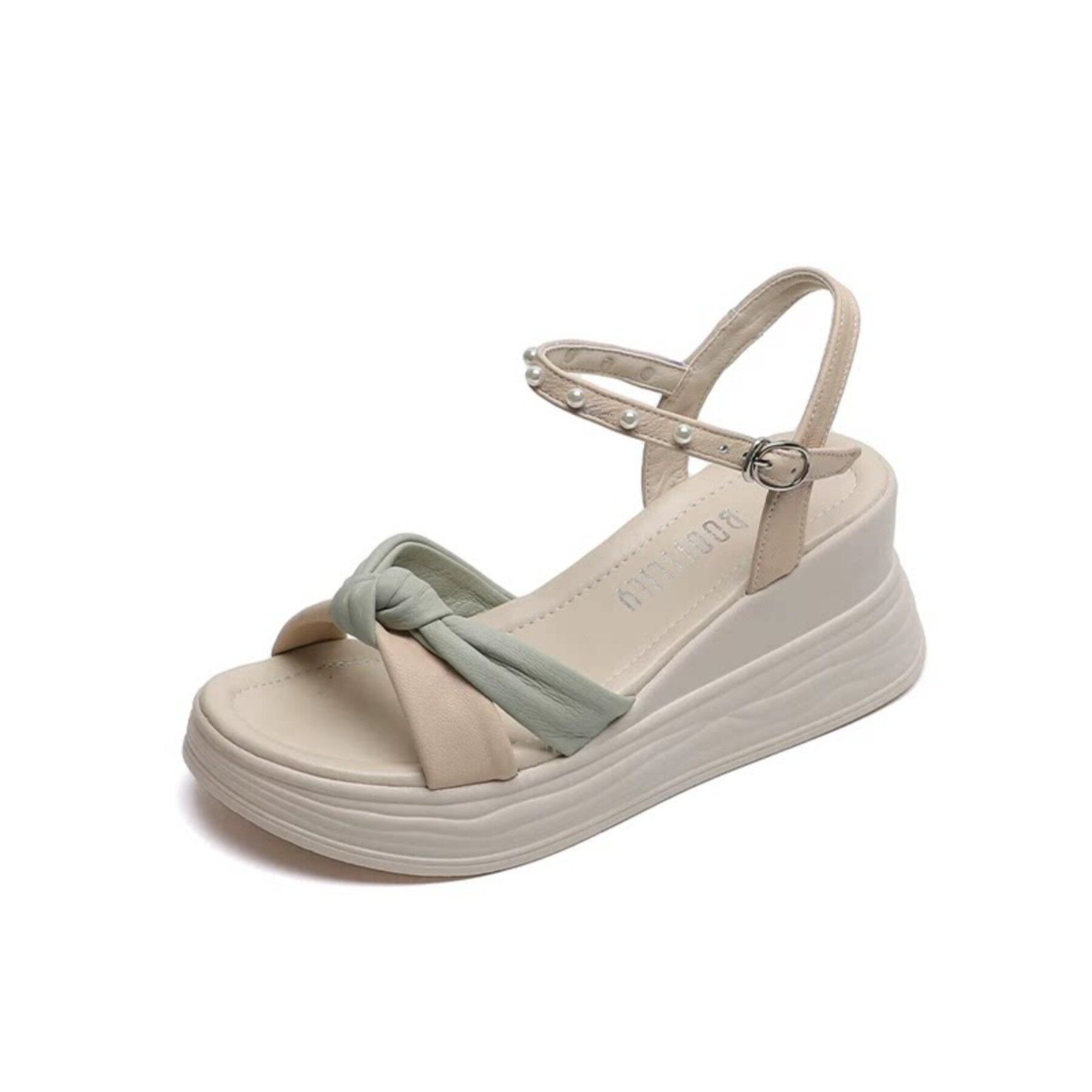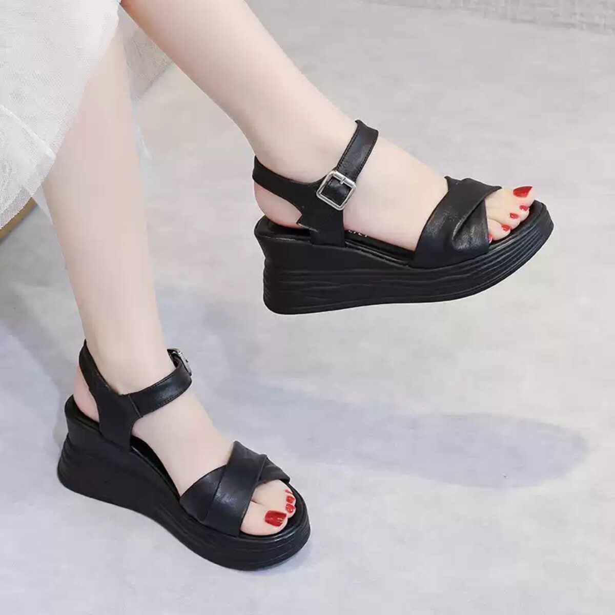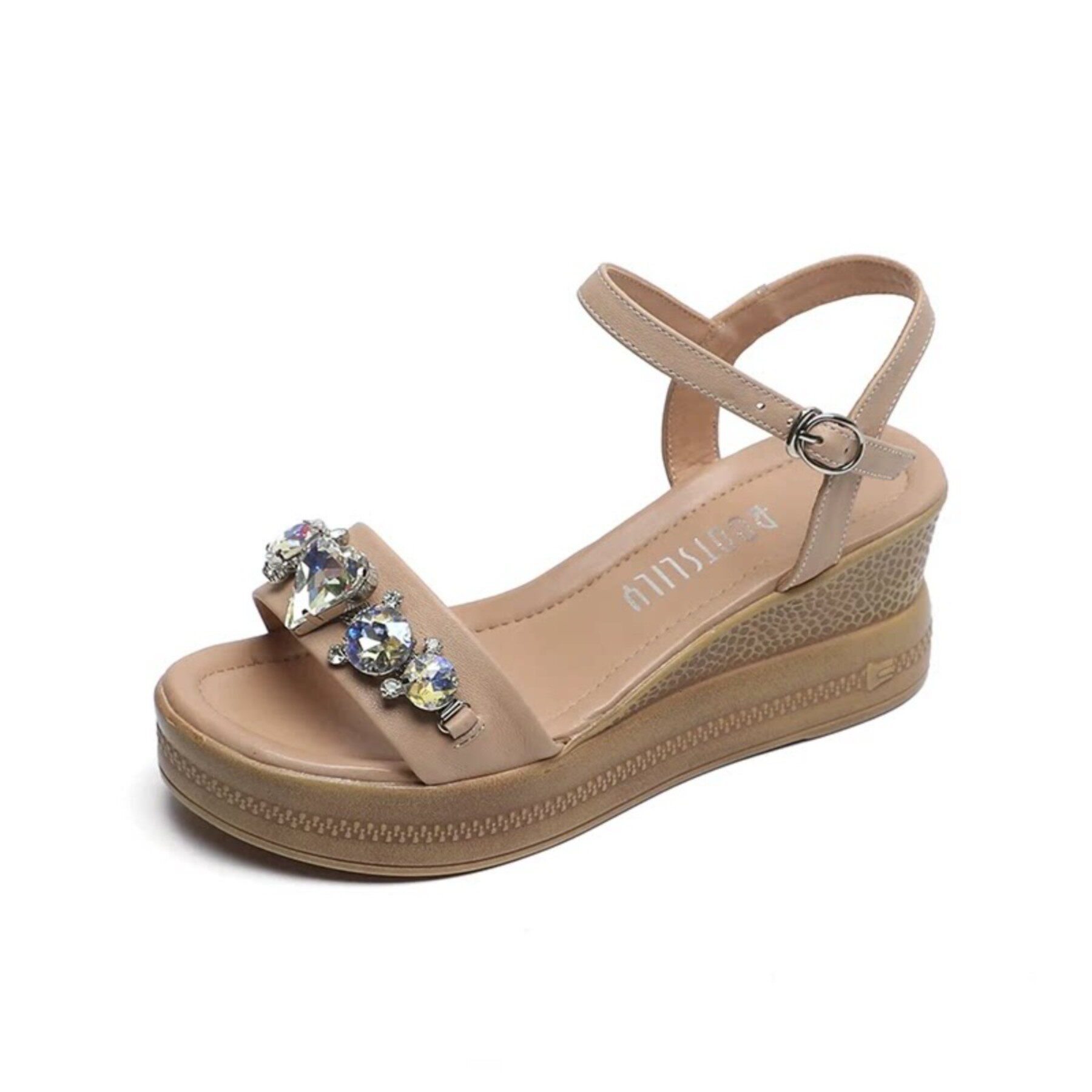 断码清仓真皮坡跟凉鞋女夏季时尚百搭松糕厚底一字带露趾沙滩女鞋