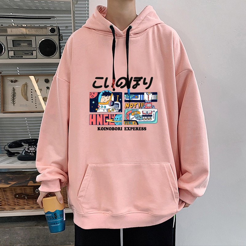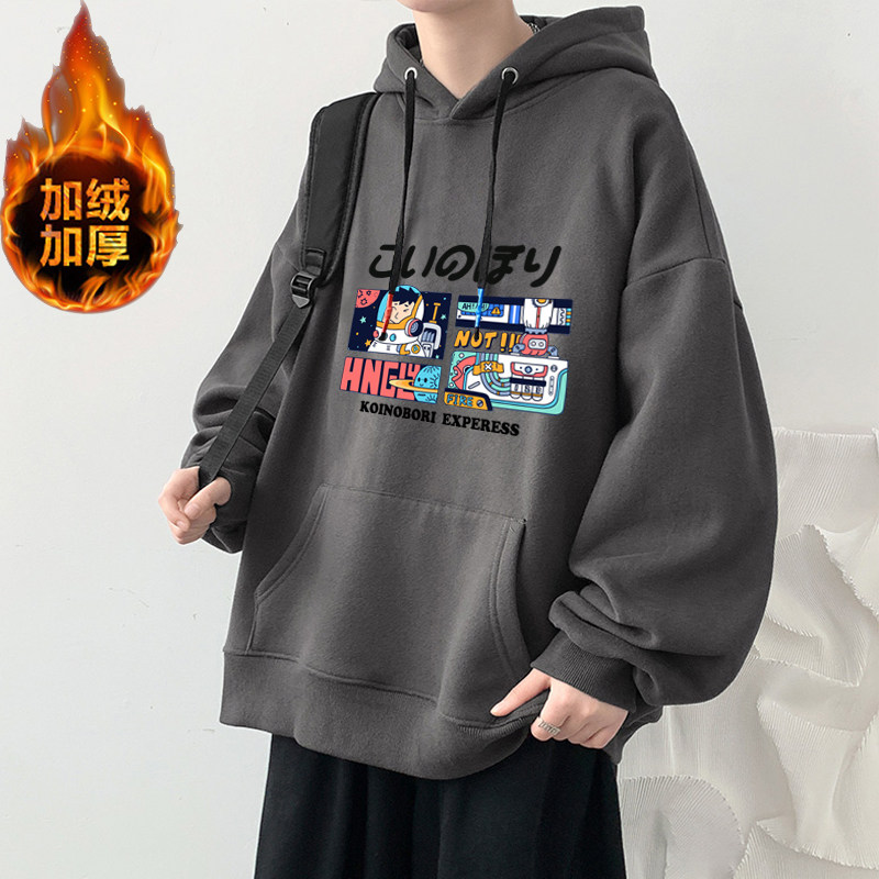 冬季加绒青少年男生粉色连帽卫衣男初中学生带帽加厚上衣服秋冬款