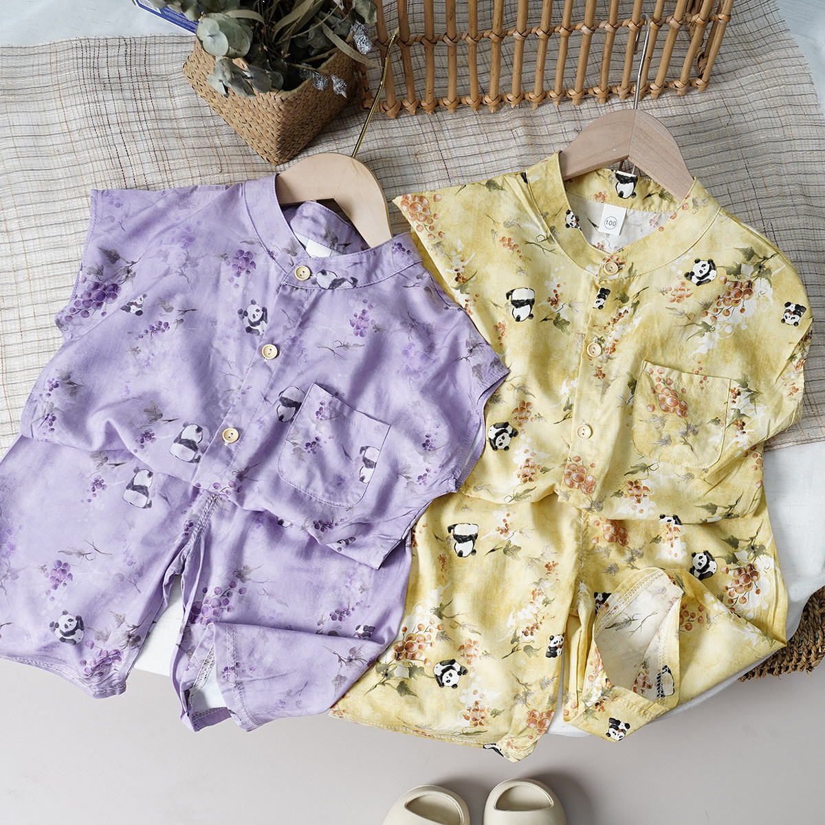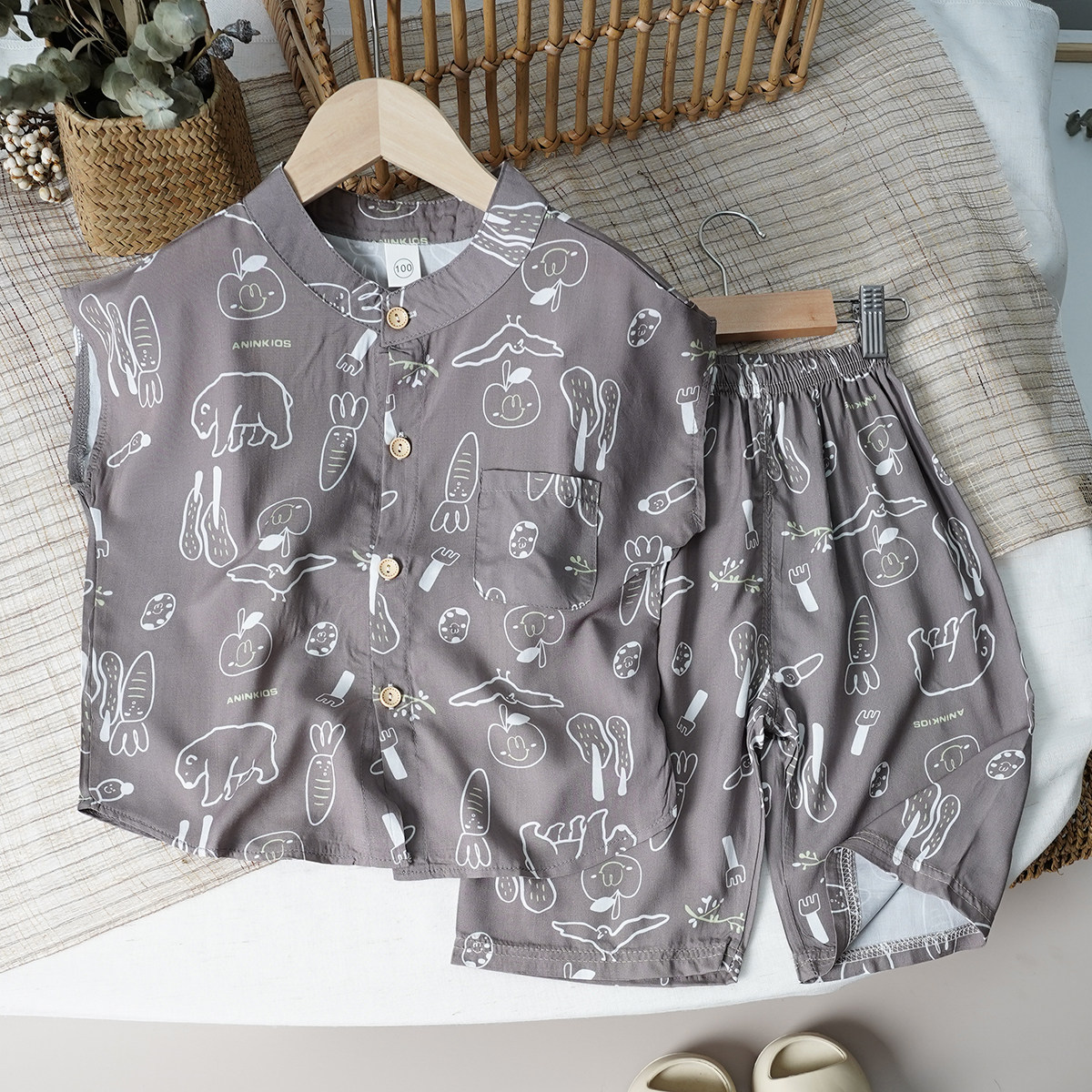 小清新儿童棉绸衬衣裤子两件套夏季男女宝宝人造棉短袖七分裤套装