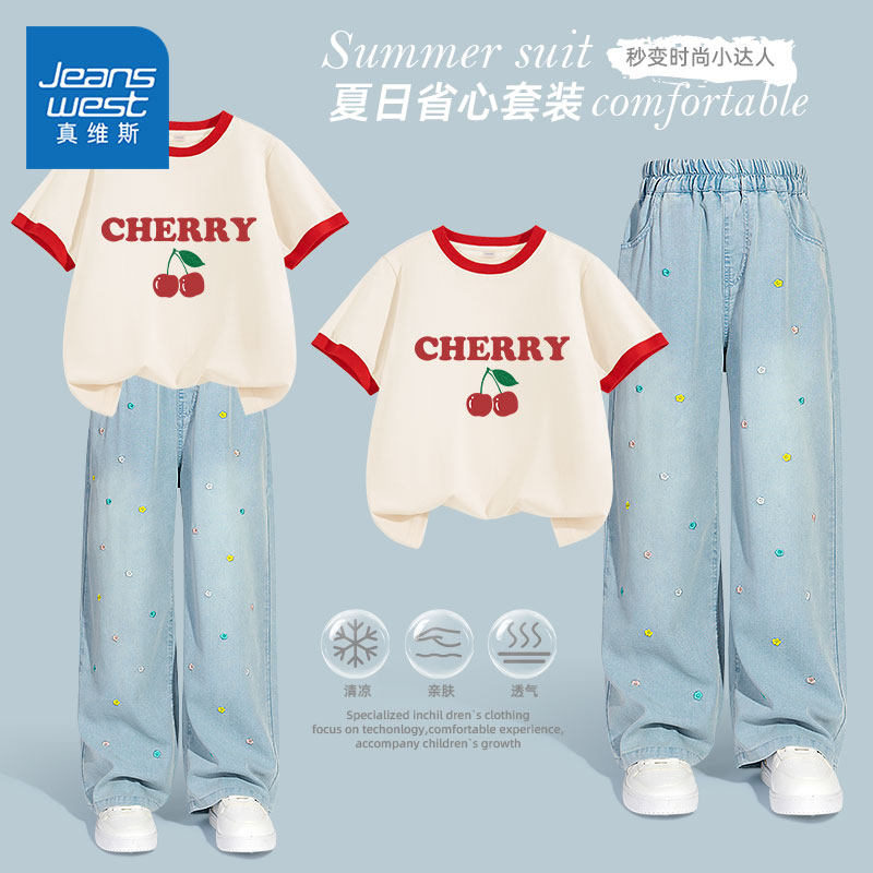 真维斯童装女童夏季短袖t恤中大童时尚潮流套装儿童夏款纯棉上衣