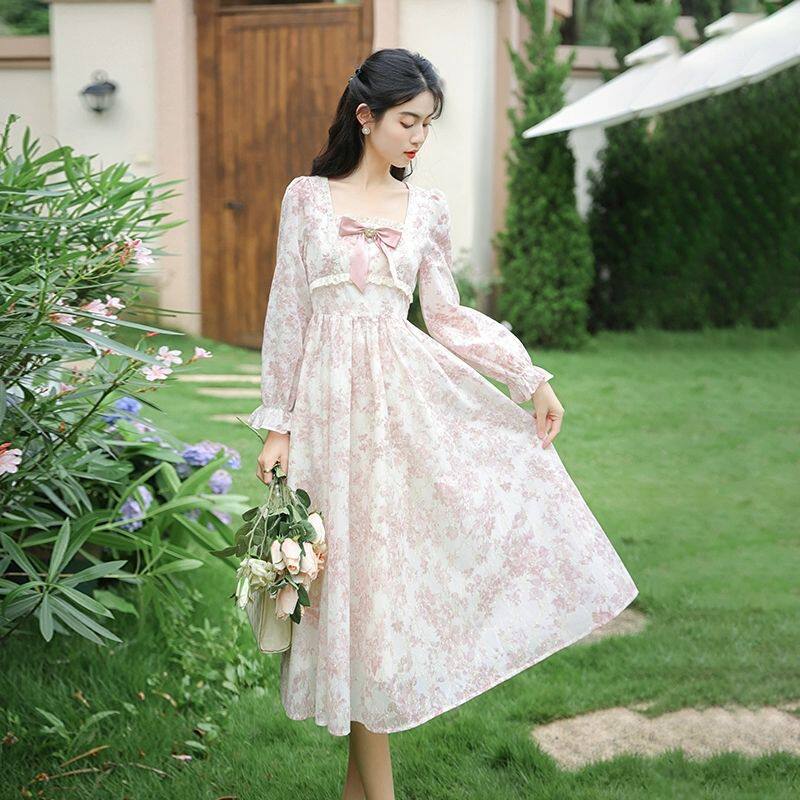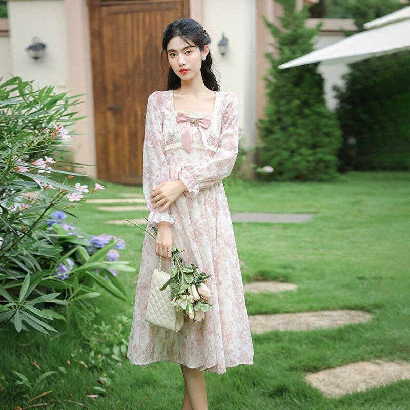 法式甜美碎花长袖连衣裙女秋冬高级感气质长裙收腰温柔风仙女裙子