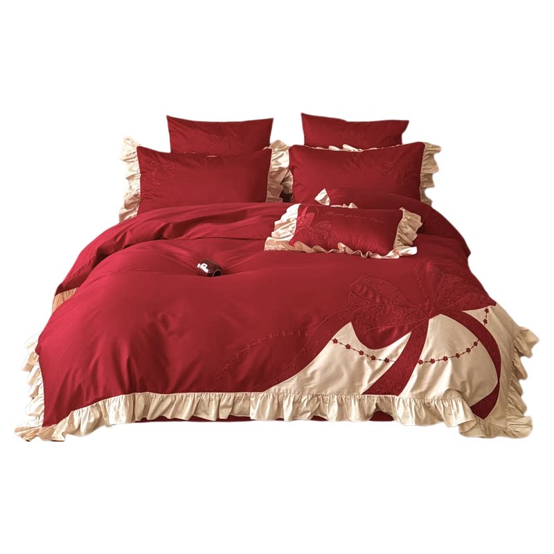 大红色蝴蝶结婚四件套床上用品高端上档次全棉婚庆陪嫁婚礼年轻人