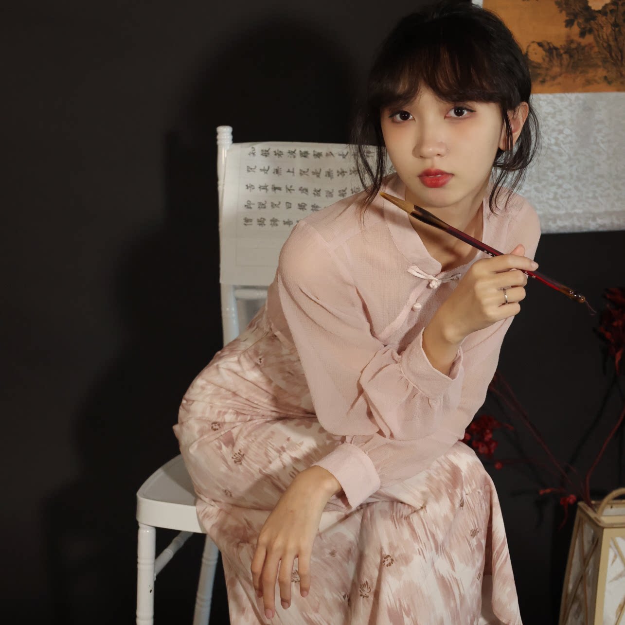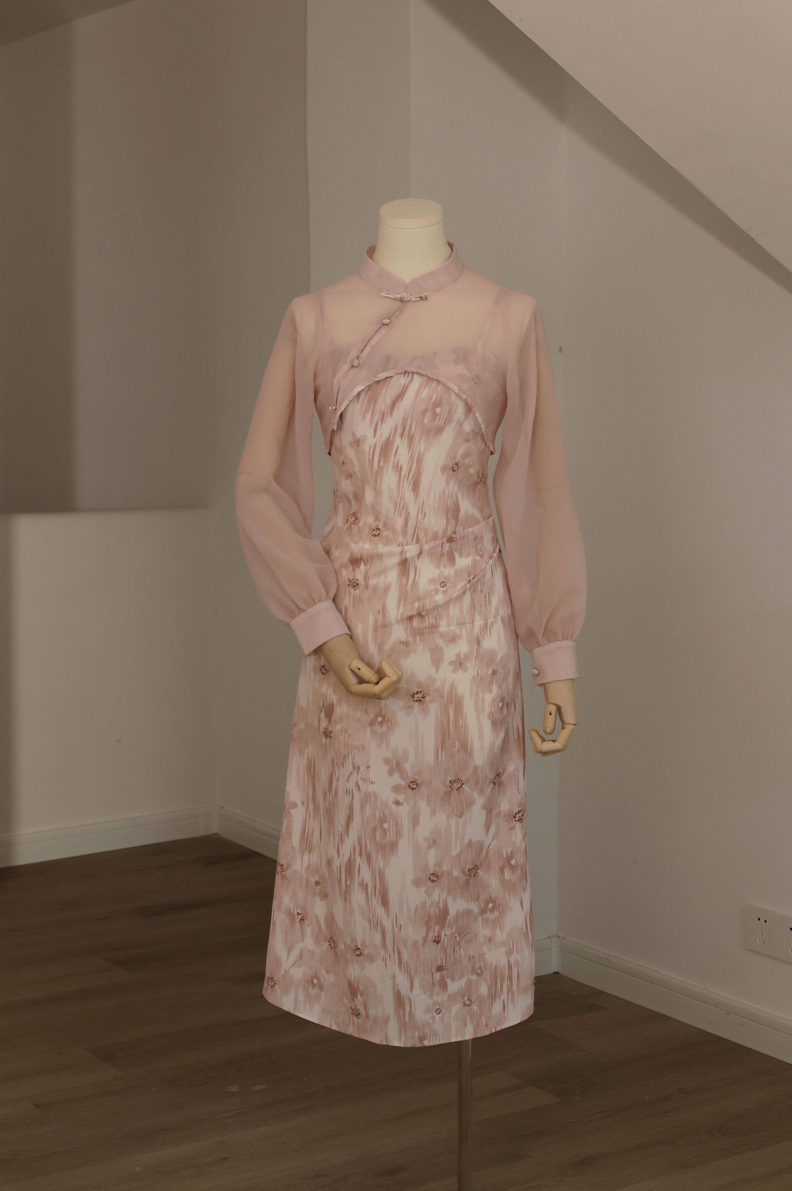 喵吉国风甜美长袖修身收腰中长款小个子粉色雪纺连衣裙两件套女秋