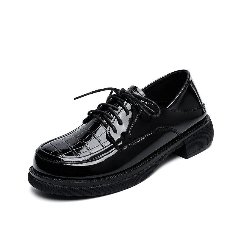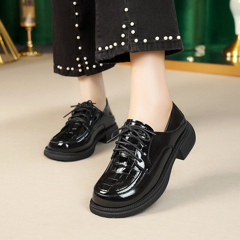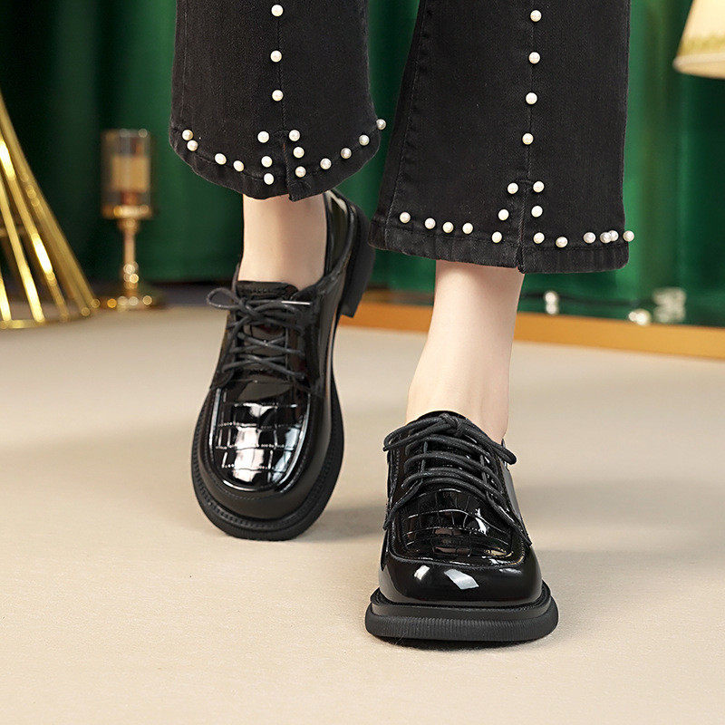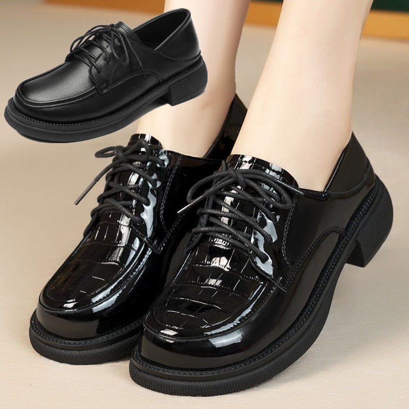 春春款女鞋子黑色亮面漆皮系带皮鞋女厚底粗跟不累脚软底深口单鞋
