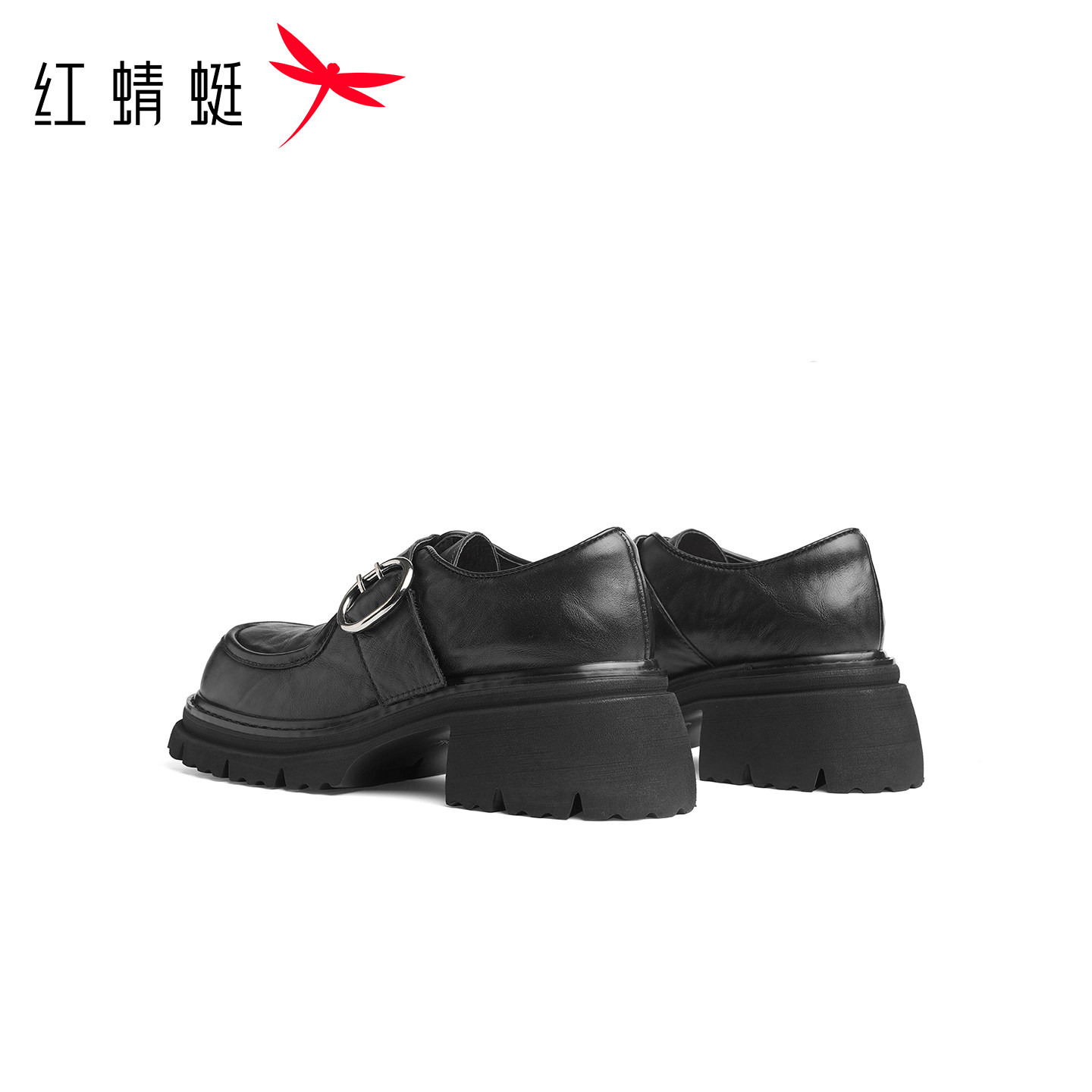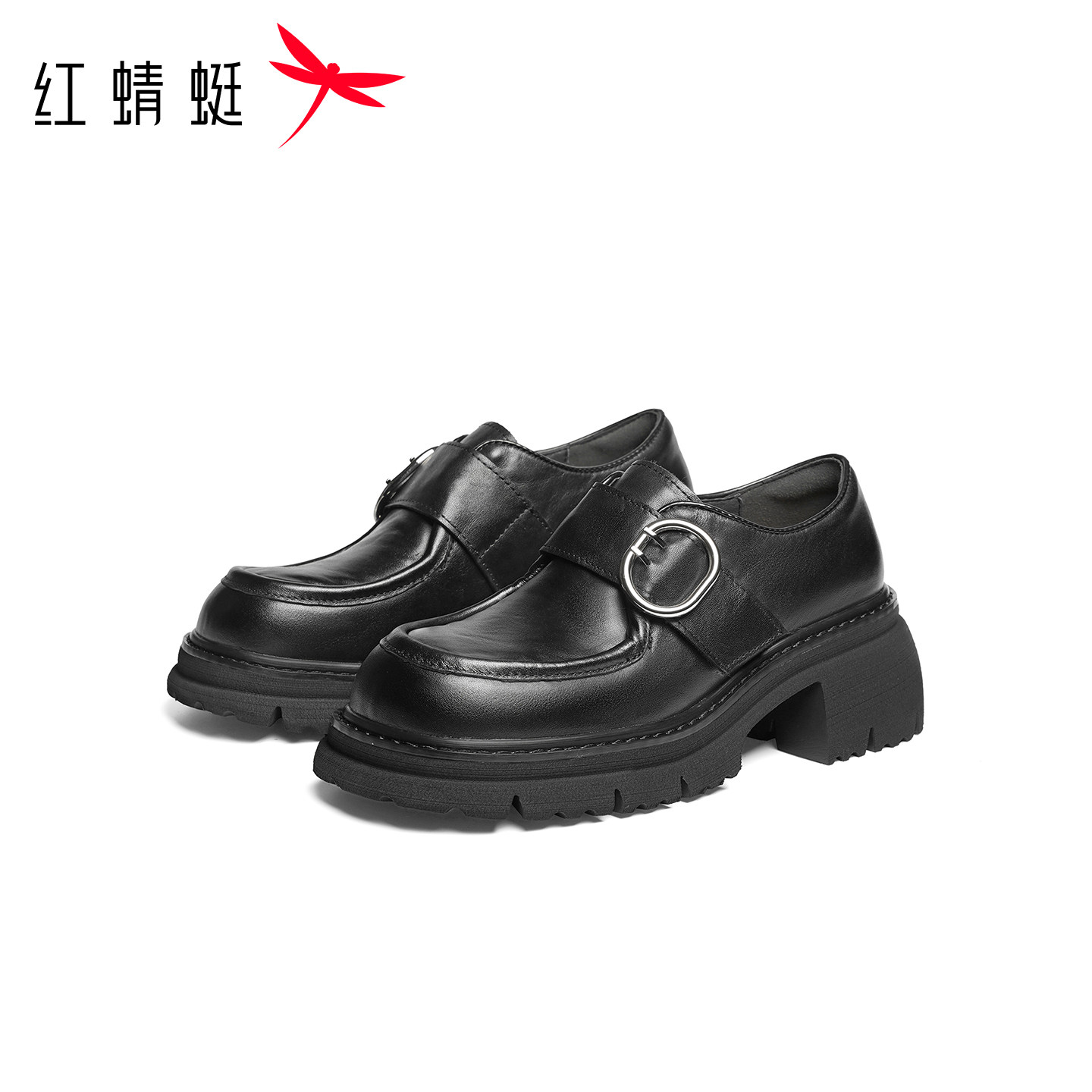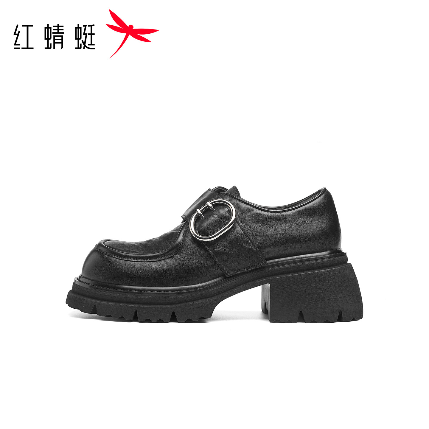 红蜻蜓厚底乐福鞋女春季新款女鞋真皮粗跟鞋子增高黑色英伦小皮鞋
