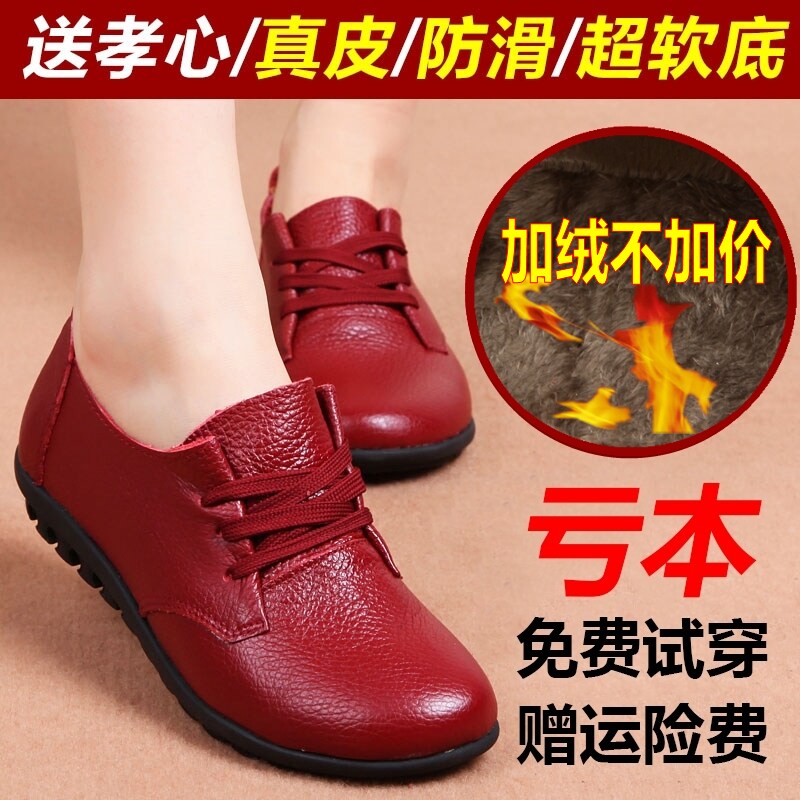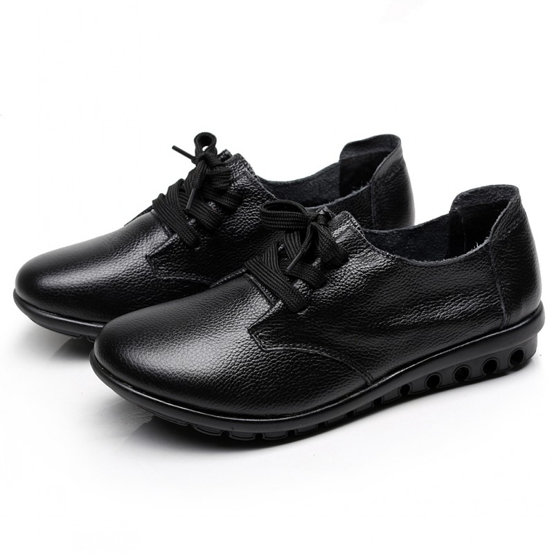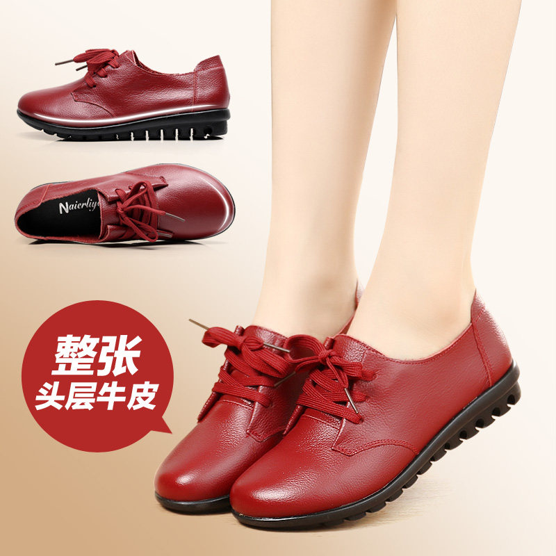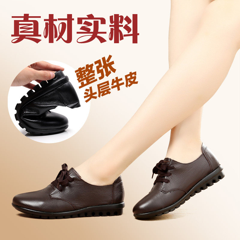 春秋季平跟系带真皮平底单鞋女鞋子软底大码中老年皮鞋低跟妈妈鞋