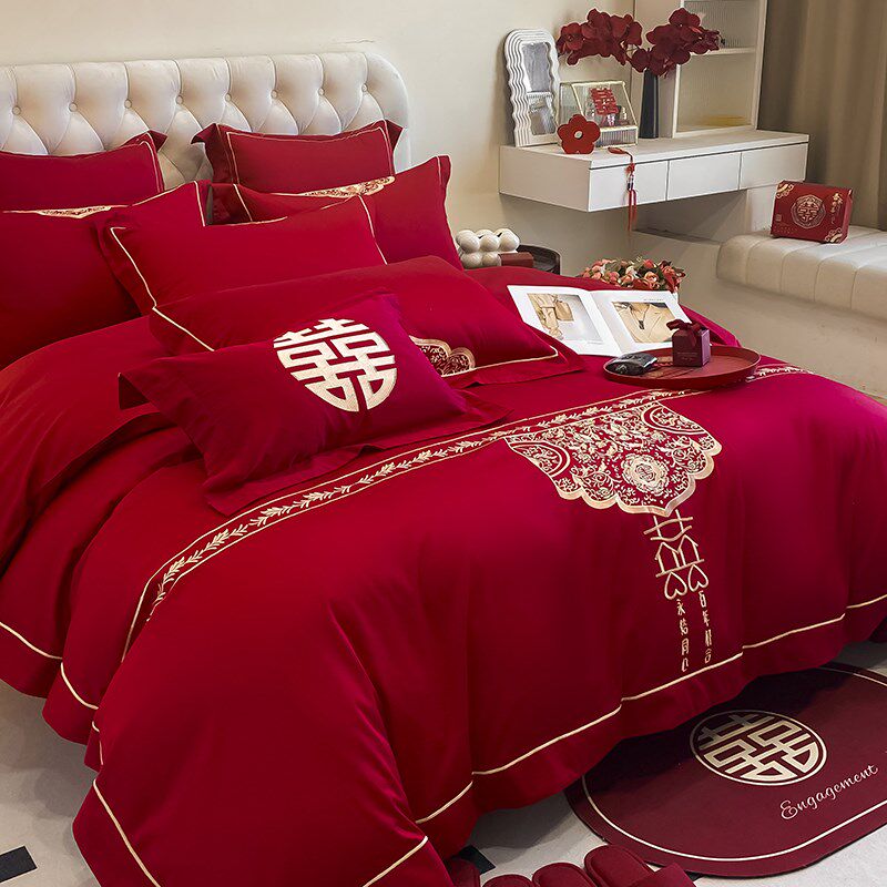 结婚喜庆四件套纯棉全棉磨毛红色刺绣婚房婚礼被套床单床上用品