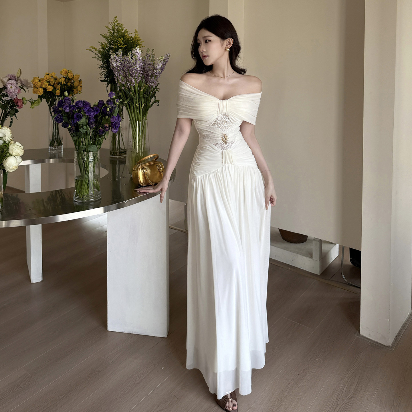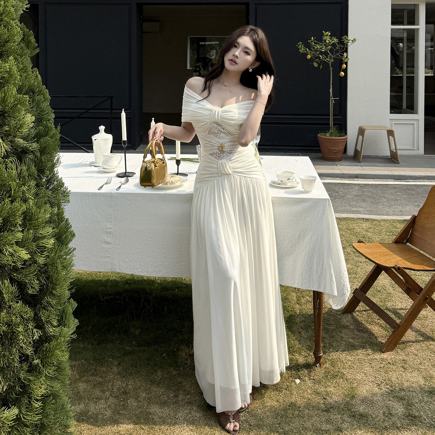 GirlsAt18 白色一字肩连衣裙女夏季高级性感生日礼服裙度假长裙