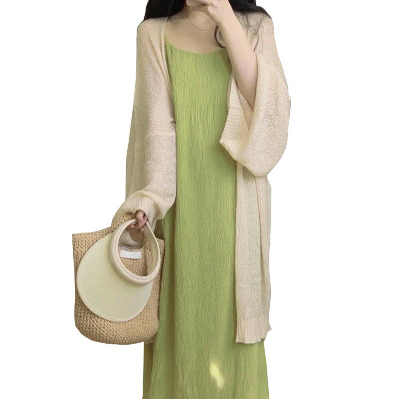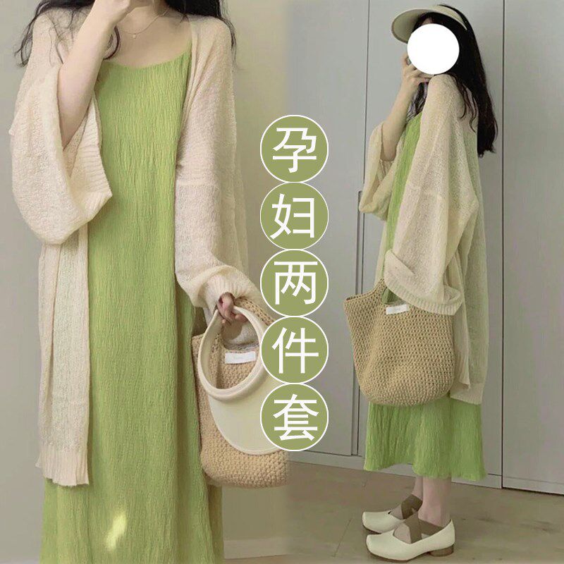 孕妇长袖连衣裙套装早春长裙显瘦气质韩版百搭开衫+吊带长裙2件套