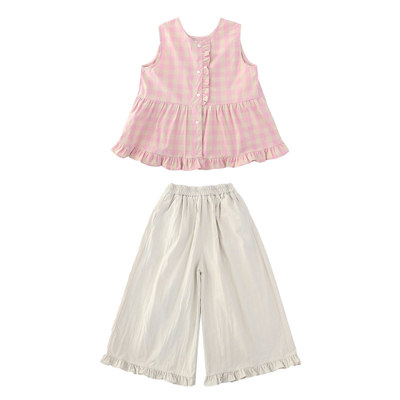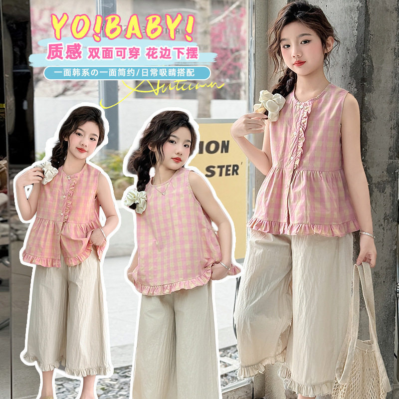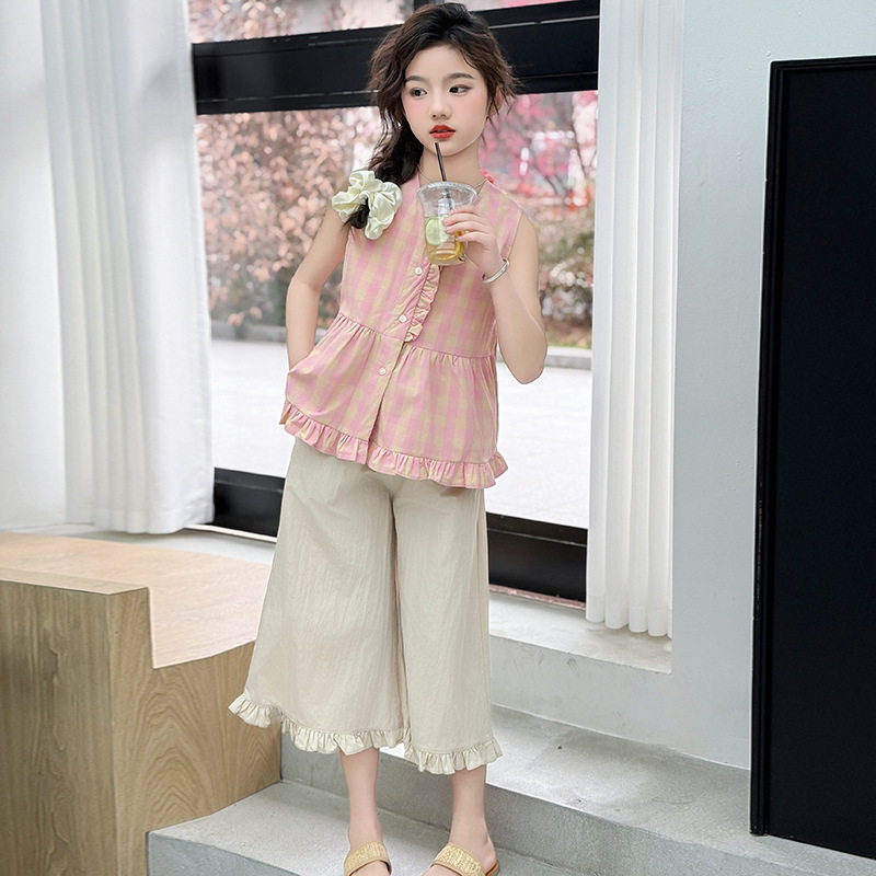 女童套装夏季2025新款中大童洋气时髦夏装女孩短袖格子衬衫