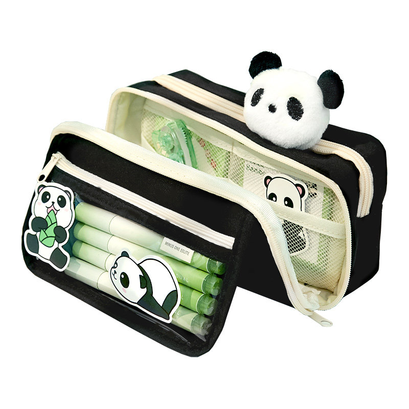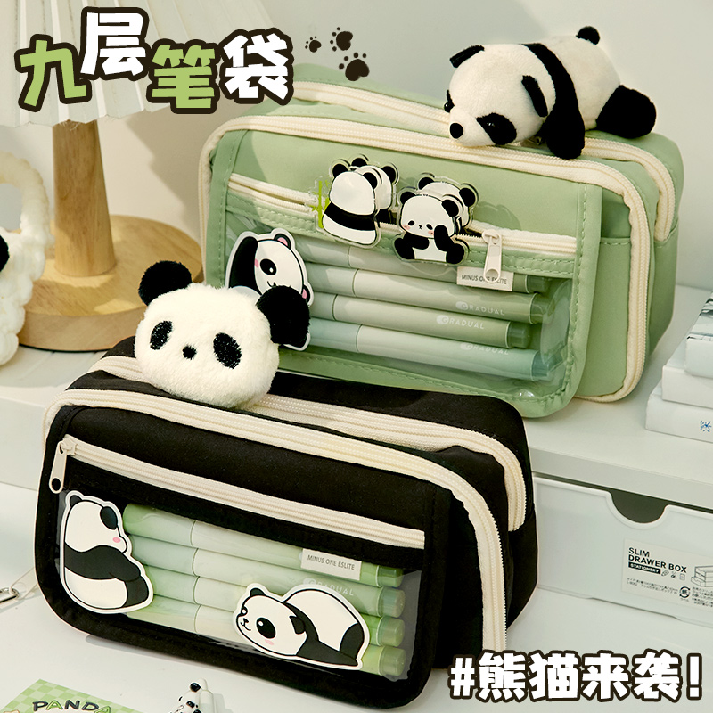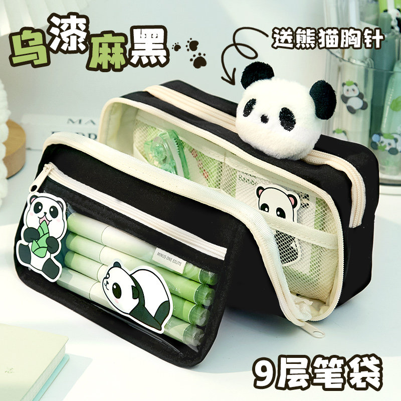 9层超大容量熊猫笔袋女生初中生专用2026年新款高颜值文具盒小学生女孩版男孩男生铅笔盒透明简约黑色
