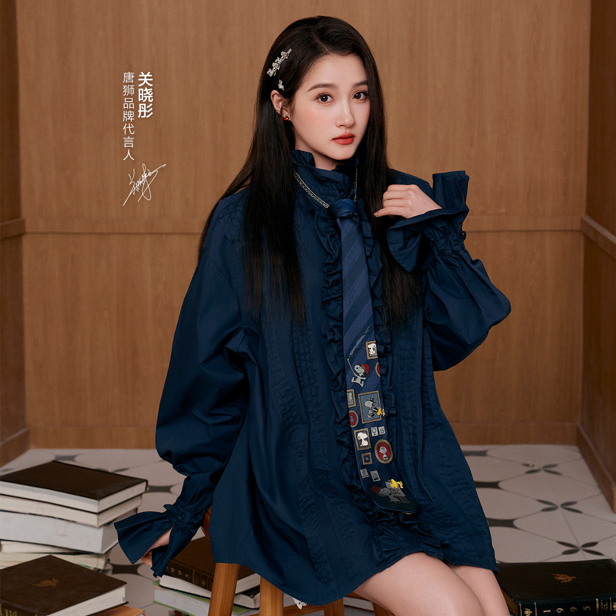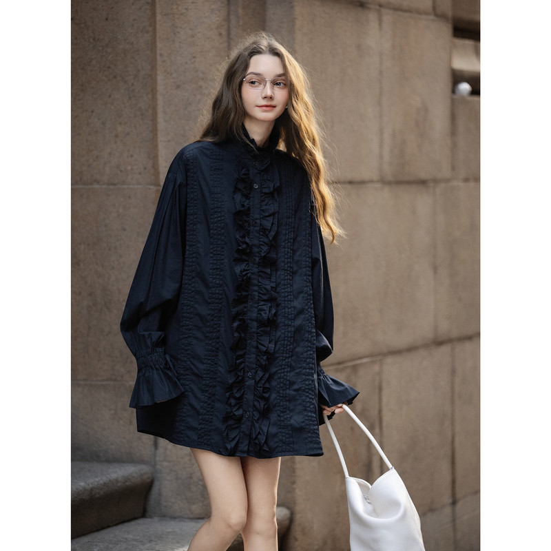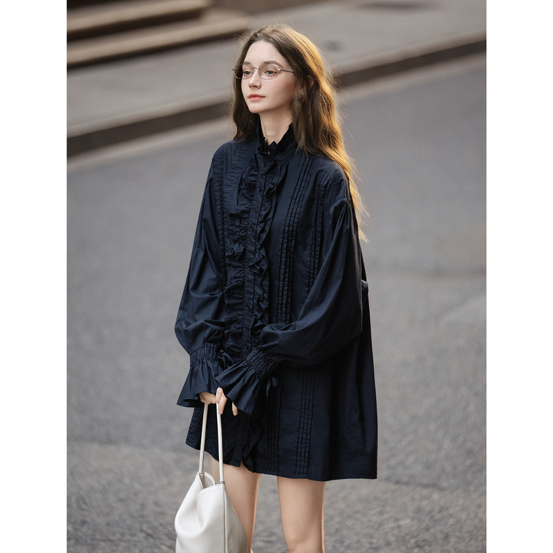 【关晓彤同款】唐狮2026春秋冬舒适精致女木耳花边长袖短款连衣裙