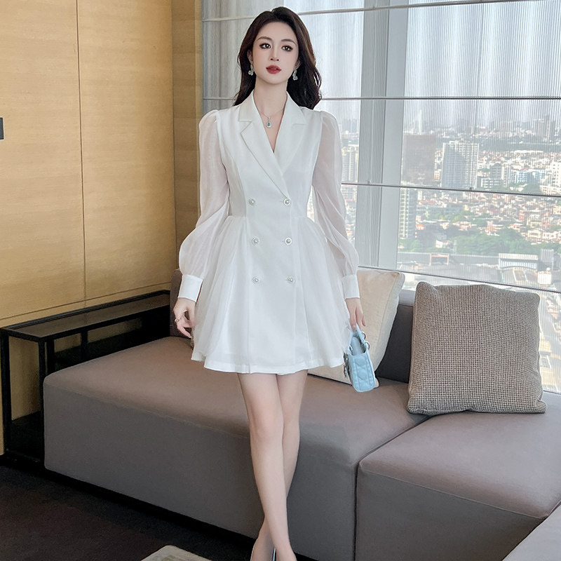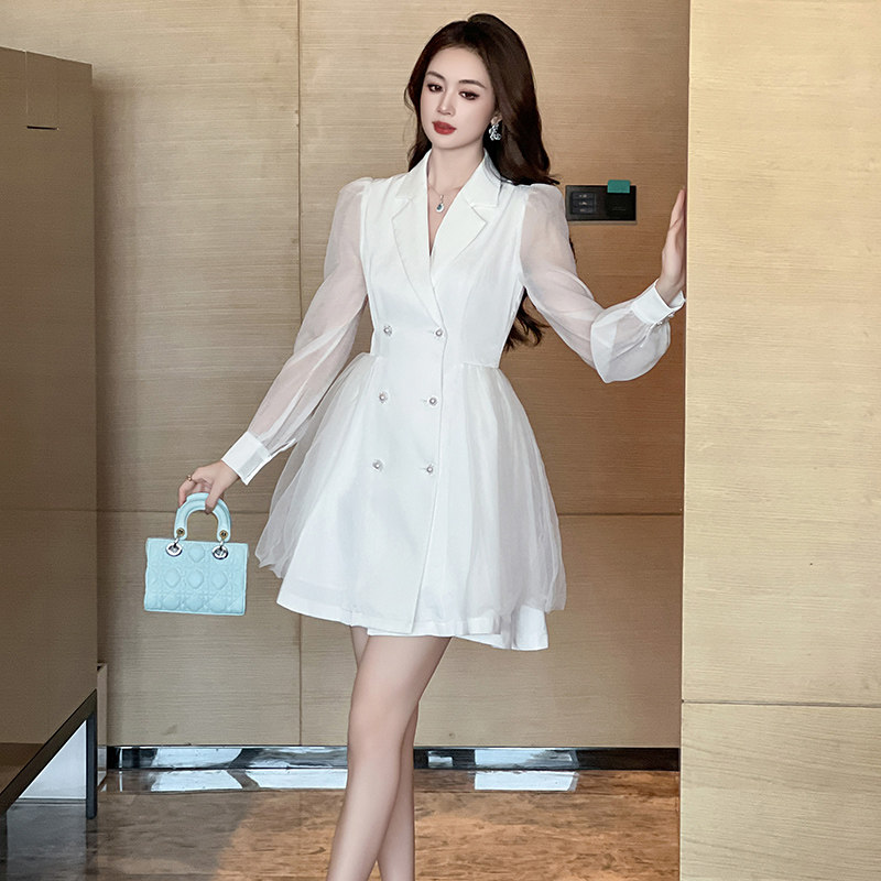 白色连衣裙女高级感打底长袖短款法式纱裙西装领公主风裙子蓬蓬裙