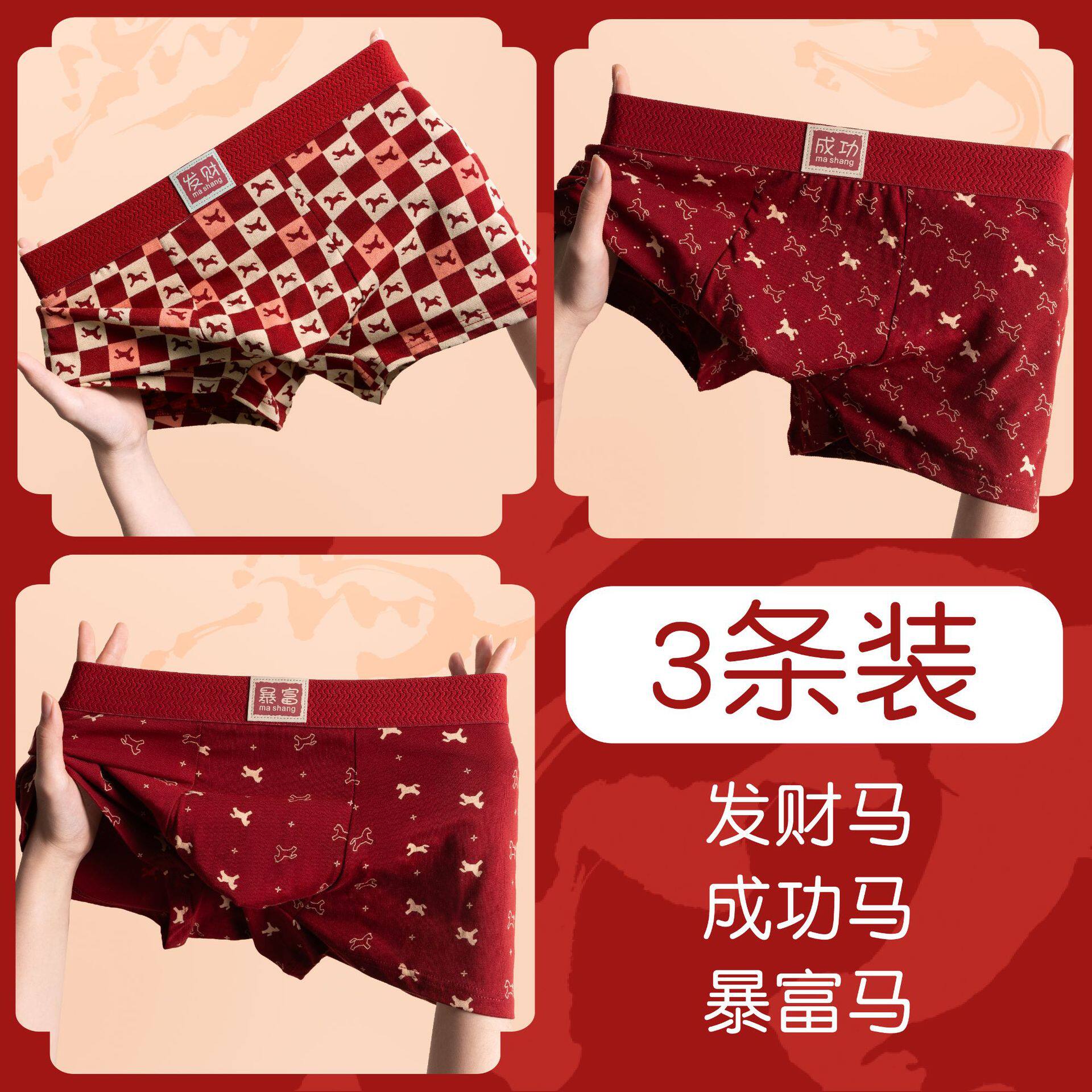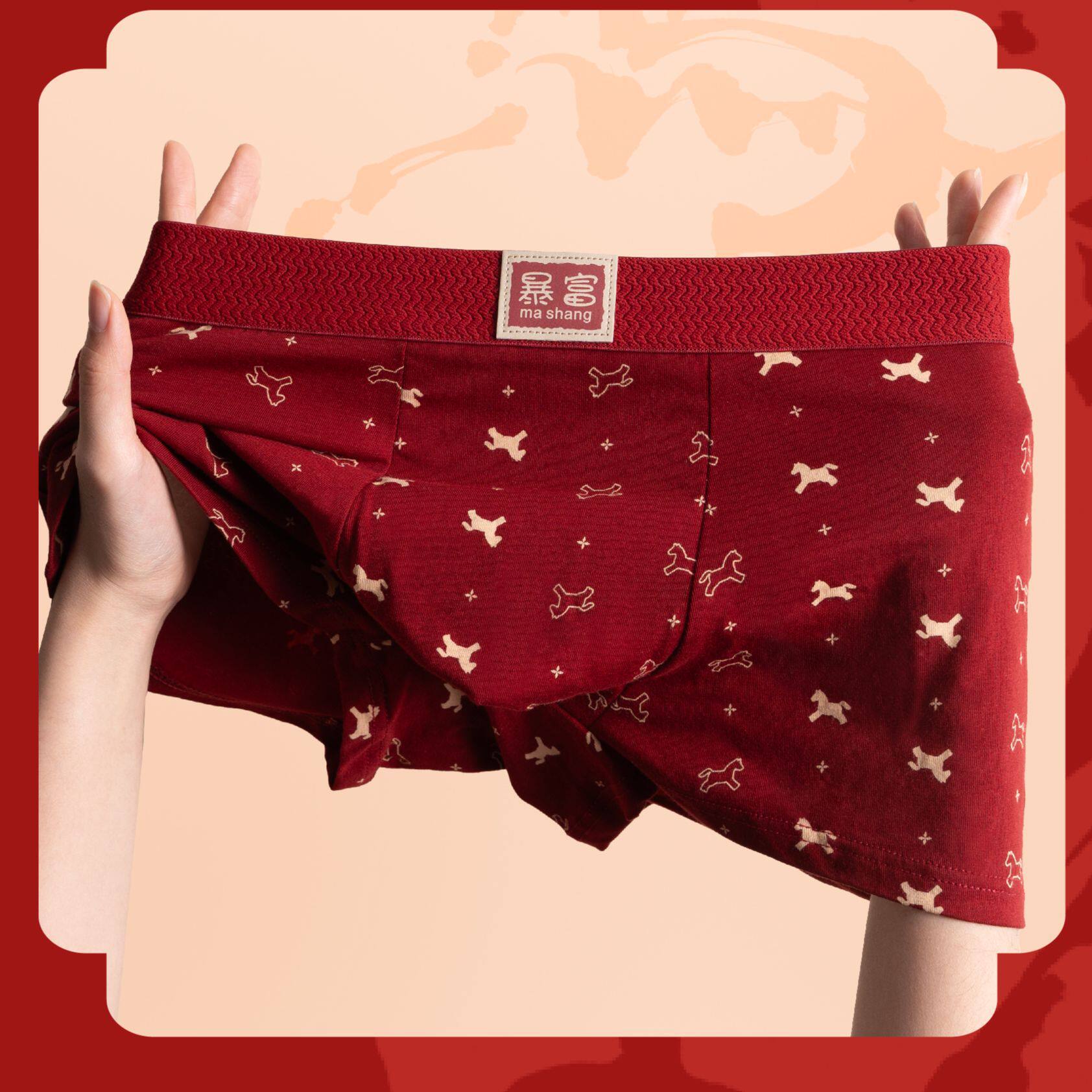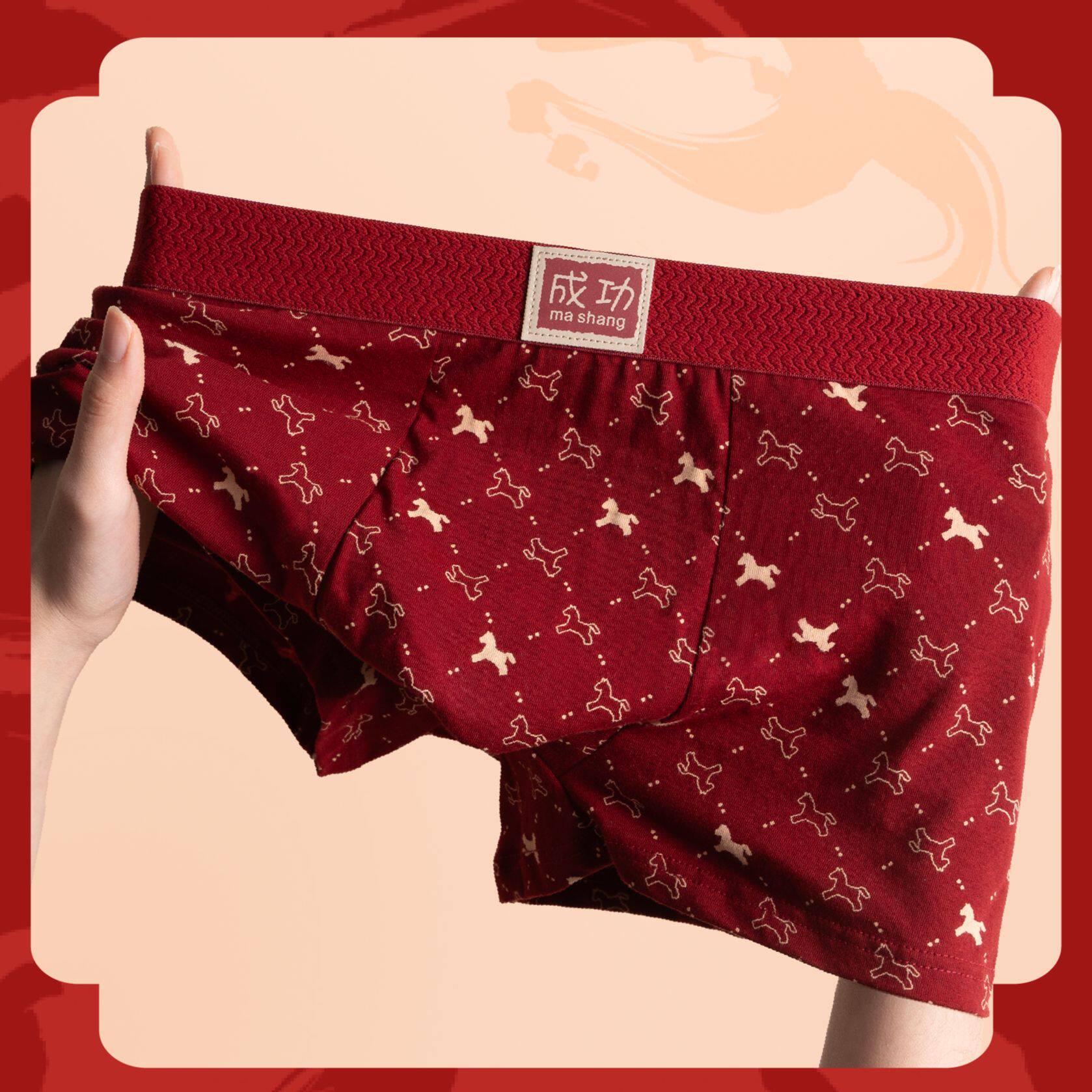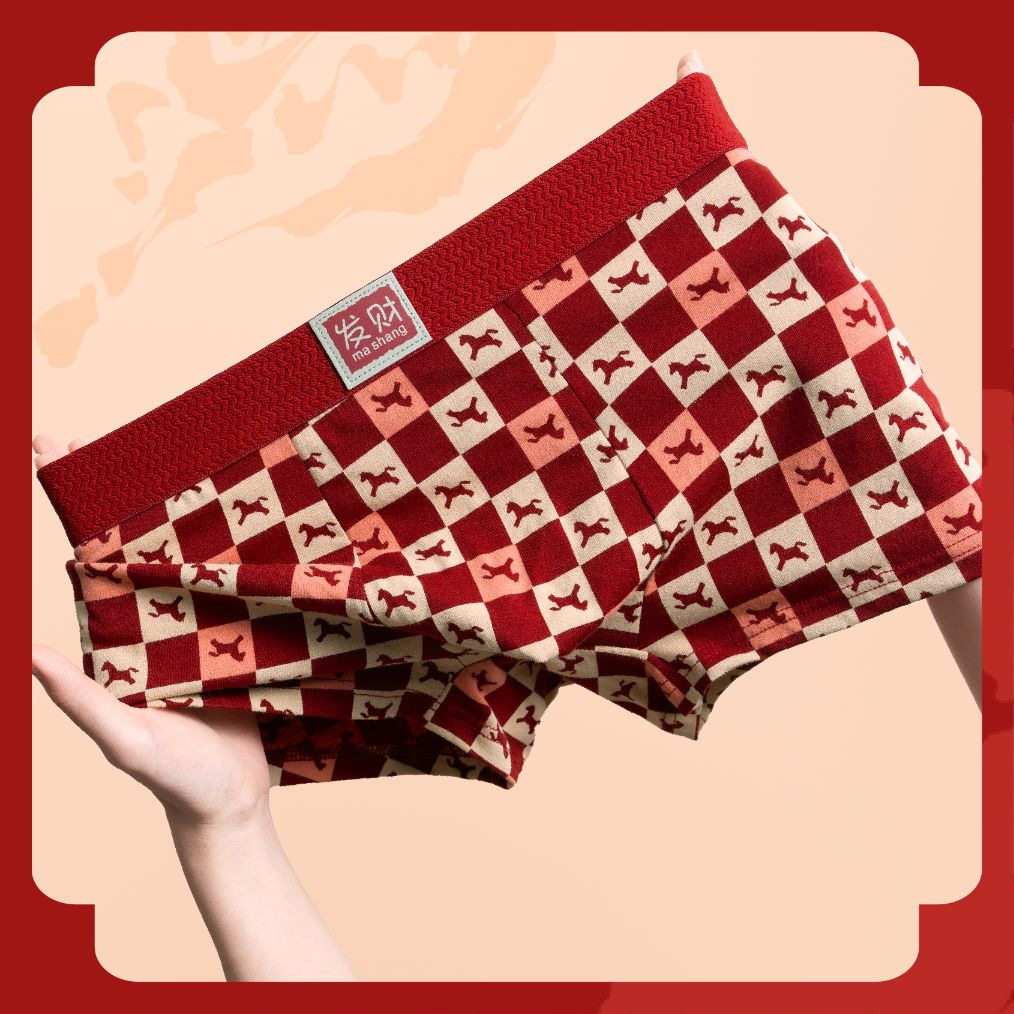 雅鹿本命年男士内裤纯棉男款平角裤大红色结婚属马年四角短裤大码