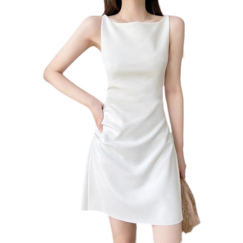 赫本风白色连衣裙女短款夏季气质高端吊带一字肩法式初恋系小白裙