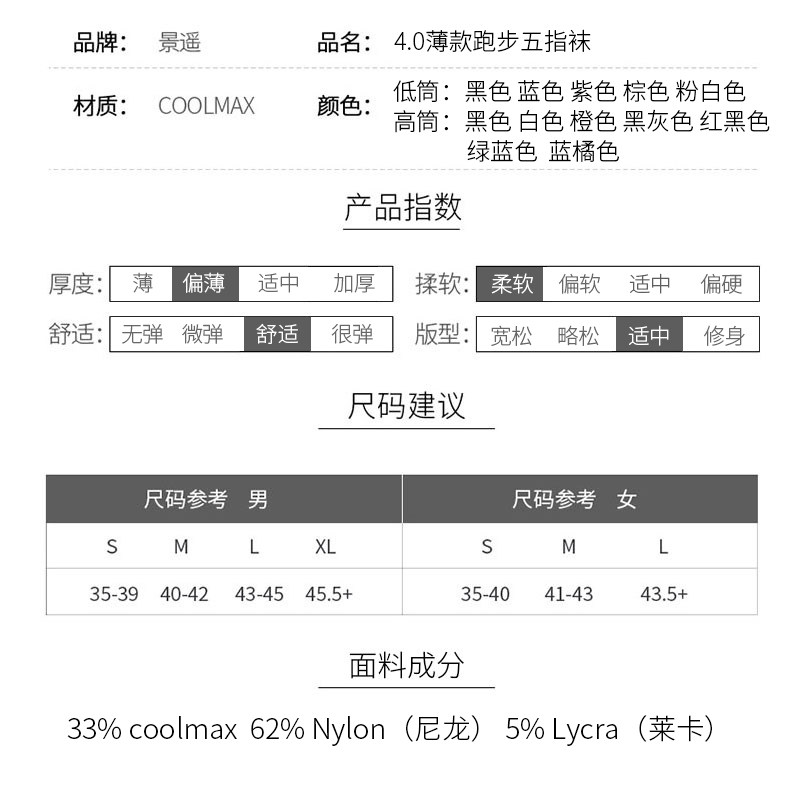 景遥4.0薄五指袜coolmax男女马拉松夏季跑步低帮排湿透气防磨速干