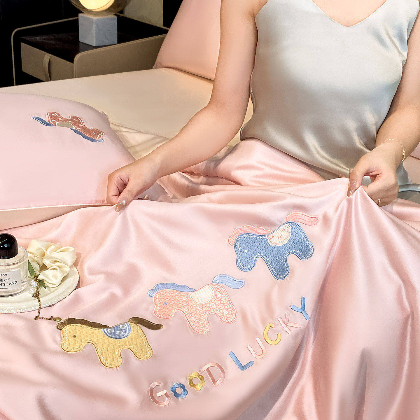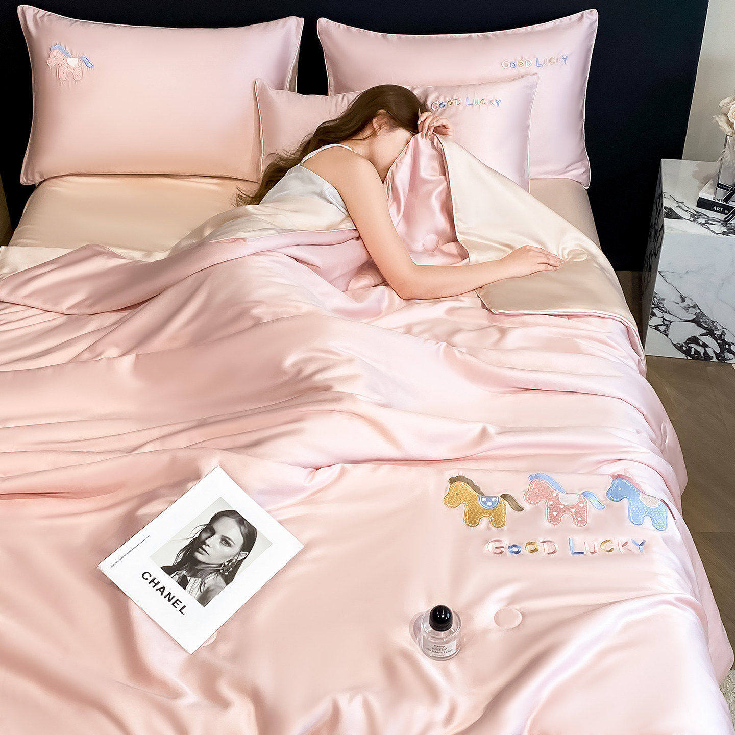 夏天冰丝夏凉被四件套轻奢高级感床笠款可机洗空调被双人冷气被芯